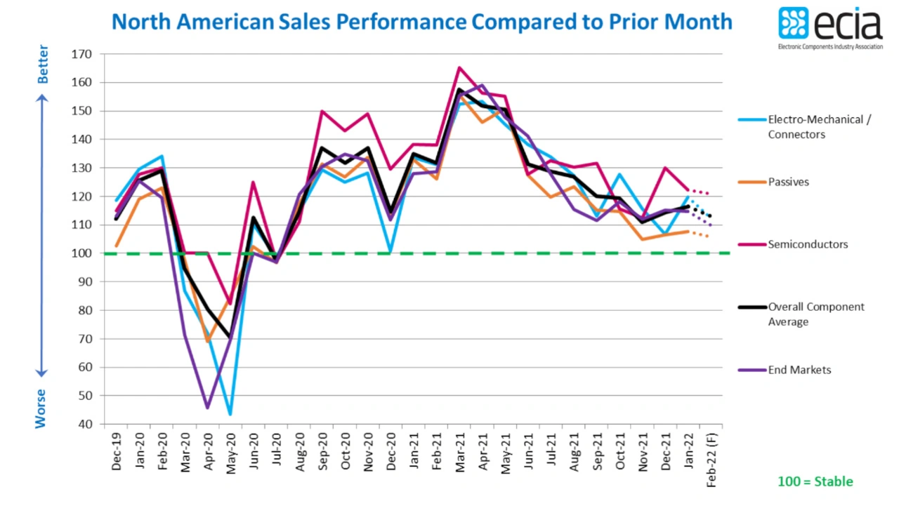 Die Stimmung bei den Halbleiterverkäufen bleibt weiterhin die optimistischste unter den drei Hauptkategorien mit einem Index von 122,2 im Januar und einem anhaltend hohen Niveau von 120,9 in den Erwartungen für Februar. Alle drei Komponentenindizes weisen einen Rückgang von Januar auf Februar auf, wobei die passiven Komponenten mit einem immer noch respektablen Wert von 107,6 im Januar und 105,9 für die Februar-Prognose am unteren Ende liegen.