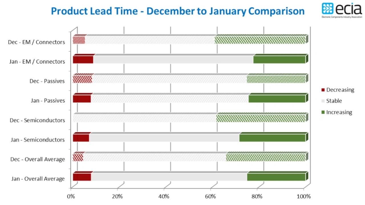 Es bleibt zu hoffen, dass diese Entwicklung darauf hindeutet, dass sich die Lieferzeiten längerfristig verkürzen, da die jüngsten Daten für Dezember in anderen ECIA-Untersuchungen zeigen, dass sich die Lieferzeiten weiterhin auf breiter Front verlängern.
