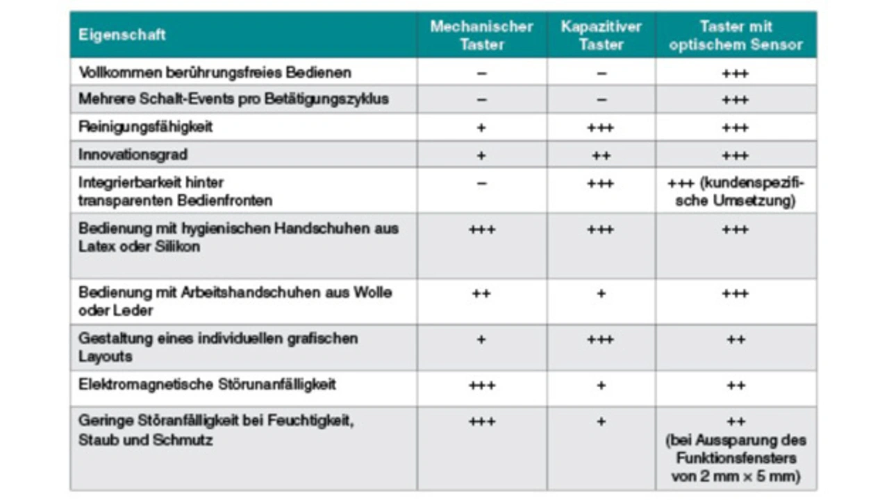 Taster mit optischer Erkennung entfalten ihre Vorteile besonders dort, wo Mehrfachfunktionalität und/oder ein hoher Hygieneschutzgrad im Mittelpunkt stehen. Im direkten Vergleich mit anderen Tasterarten ergibt sich die Übersicht, die in der Tabelle dargestellt ist.
