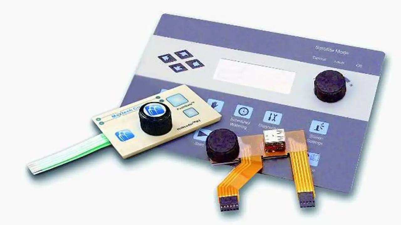 Die Integration von Signalgebern (Piezo-Summern) als elektronisches Bauteil ist auch möglich. Die »Duraswitch«-Technologie ermöglicht zudem die Integration von Drucktastern mit taktiler Rückmeldung, Drehgebern (Drehencoder und analoge Potentiometer; Bild 4) und Cursorsteuerungen. Gegenüber separaten Lösungen ist die integrierte Lösung kostengünstiger, da Verdrahtungs- und Lötprozesse entfallen und sich die Montagezeit verkürzt.