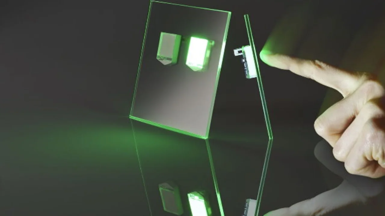 Unter dem Klebefilm befindet sich als zweite Schicht der ITO-Sensor, der Änderungen im kapazitiven Feld auf der anderen Seite der Oberfläche registriert und entsprechende Befehle an die Auswertelektronik weiterleitet. Die dritte Schicht bilden ein Backlight und die dazugehörige LED-Beleuchtung, deren Farbe an kundenspezifische Anforderungen angepasst werden kann. Zuunterst liegt die Auswertelektronik, wobei die Kontaktierung zum Grundkörper über eine vierpolige Stiftleiste erfolgt.