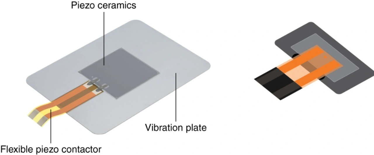 Speziell für den Einsatz in Fahrzeug- und Smartphone-Displays hat TDK die Typen L8060 und L3015 entwickelt. Sie bestechen durch ihre extrem geringen Bauhöhen von nur 0,35 mm beziehungsweise 0,3 mm bei Flächen von 80 × 60 mm2 (L8060) oder 30 × 15 mm2 (L3015). Der unimorphe Aufbau des PiezoHapt basiert auf einem flachen Vielschicht-Piezoelement, das auf einer Seite mit einer Vibrationsplatte verbunden ist und direkt unter Displays verbaut werden kann (Bild 1).