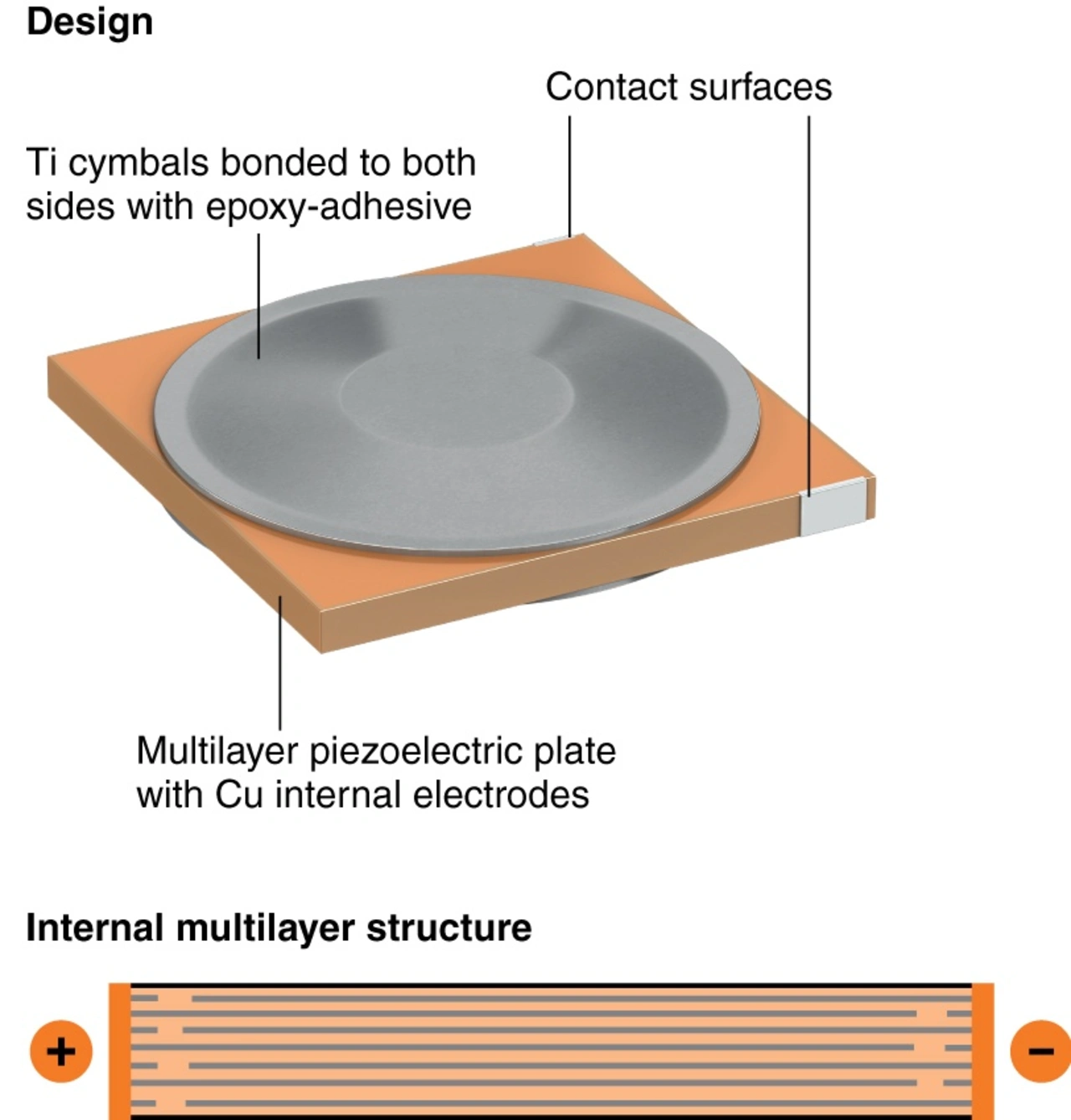 Wird an die Piezoscheibe eine Spannung angelegt, dehnt sie sich in z-Richtung nur minimal aus, kontrahiert aber aufgrund der Volumenerhaltung des Piezoeffekts gleichzeitig in x- und y-Richtung. Diese Kontraktion wird mit Hilfe von zwei Zimbeln aus Titan, die auf beiden Seiten der Scheibe befestigt sind, in z-Richtung um den Faktor 15 verstärkt und es ergibt sich bei dem größten Typ 2626H023V120 eine Auslenkung von 230 µm. Von Vorteil ist die hohe Linearität zwischen angelegter Spannung und Auslenkung. Sie beträgt bei diesem Typ 1,8 µm/V. Dadurch ist eine präzise und gleichzeitig variable Ansteuerung bezüglich der Amplitude und Signalform möglich.