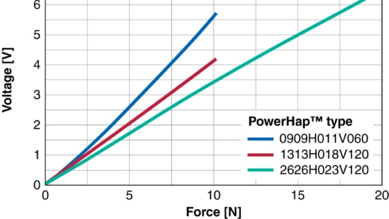 Neben den aktorischen Fähigkeiten verfügen die PowerHap-Bauelemente dank der Piezo-Vielschichttechnik auch über sensorische Eigenschaften. Im Gegensatz zu konventionellen Schaltern oder Tastern, die bekanntlich nur die Schaltzustände „Ein“ und »Aus« kennen, liefert PowerHap eine Ausgangsspannung die proportional zum ausgeübten Druck ist (Bild 4).