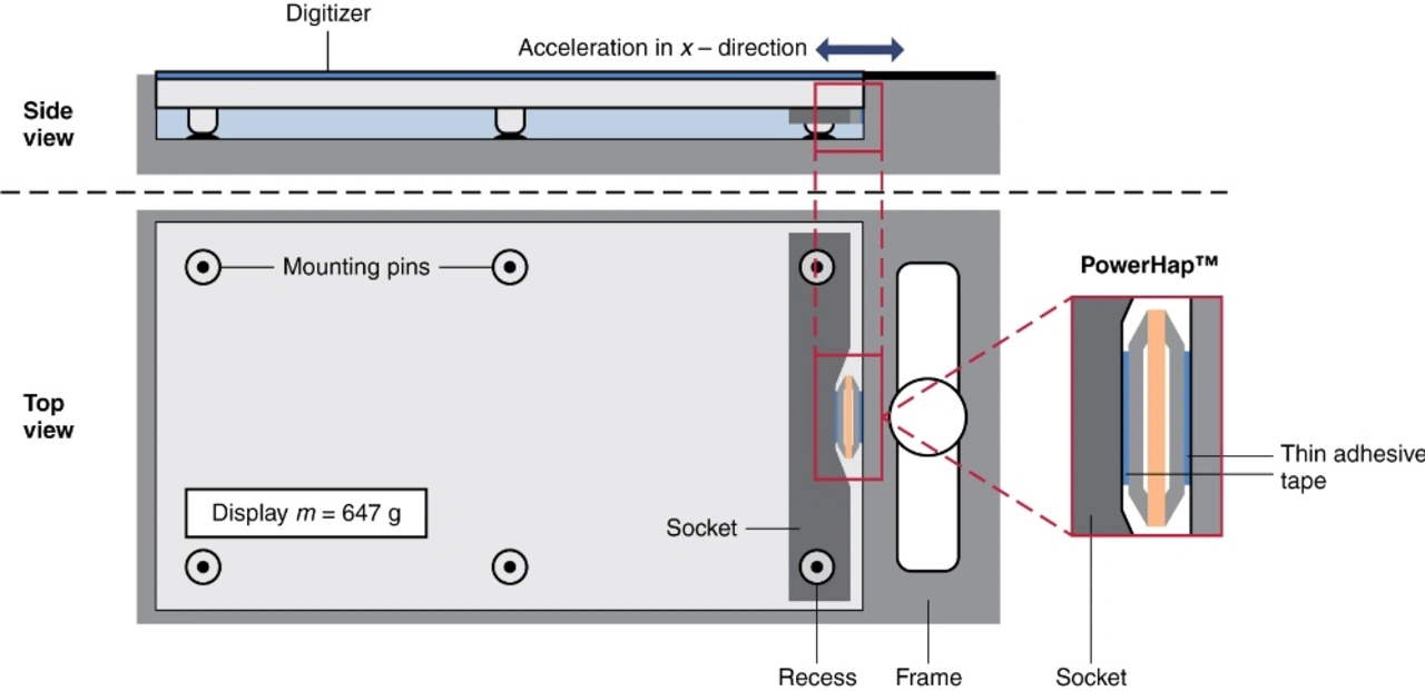 Neben den quadratischen PowerHap-Typen, die sich besonders für den Einsatz in Flächen eignen, hat TDK auch vier rechteckige, schmale PowerHap-Varianten entwickelt (Tabelle 2), die neben dem senkrechten auch ein laterales Signal erzeugen können. Die beiden kleinsten Ausführungen mit Längen von nur 9 mm beziehungsweise 12 mm eignen sich besonders für Smartphones und Tablets, Haushaltsgeräte, Spielekonsolen, VR/AR-Ausrüstung, Smartwatches, Grafiktabletts oder medizinische Handgeräte. Die beiden größeren Varianten mit Kantenlängen von 60 mm sind die derzeit leistungsstärksten PowerHap-Typen, da hier Kräfte von bis 50 N erzeugt werden können und sich Massen von bis zu 1 kg bewegen lassen. Sie können zum Beispiel seitlich an Displays verbaut werden, um ein horizontales haptisches Rückmeldesignal zu erzeugen, wie in Bild 5 dargestellt.