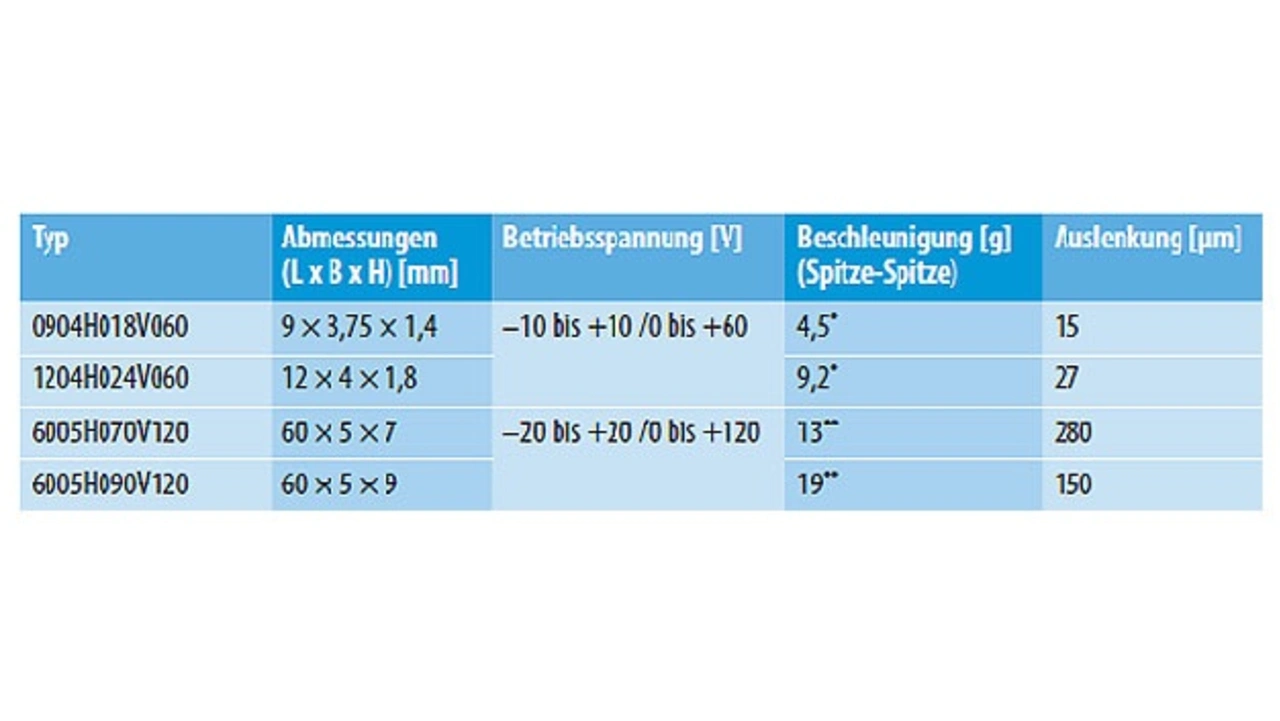 PowerHap-Aktoren (Tabelle 1) eignen sich für einen breiten Stimulationsbereich von 1 Hz bis 500 Hz mit unterschiedlichen Amplituden, Dauern und Signalformen wie Sinus, Dreieck oder Rechteck. Abhängig vom Typ liegen die Ansteuerspannung bei –20 V bis 120 V oder –10 V bis 60 V. Daher können Entwickler mit diesen Aktoren an menschlichen Mechanorezeptoren ein individuelles Signal für die haptische Rückmeldung erzeugen, passend zu ihrer Anwendung und zum Stil ihres Unternehmens. Sie können spezifische, hochauflösende haptische Profile für die Rückmeldung erstellen, wie sie von Nutzern bei hochwertigen HMI-Anwendungen im Automobil- und Industriebereich erwartet werden.