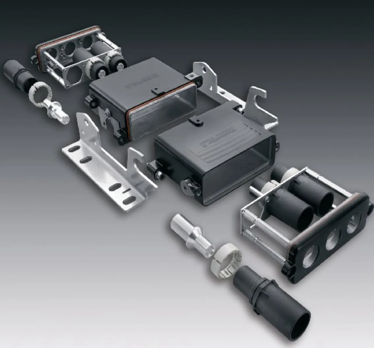 Aufgebaut ist der modulare Steckverbinder aus einteiligen Crimpkontakten, Isolierhülsen, Einsatzhalterahmen aus Edelstahl sowie einem mehrteilig realisiertem Aluminiumdruckgussgehäuse der Baugröße 8. Das Gehäuse in Schutzart IP 68/IP 69k ist hoch schlagfest sowie korrosionsresistent. Das Kontaktsystem ist in Crimpanschlusstechnik ausgeführt. Das heißt, mehr-, fein- und feinstdrähtige Kupferleiter bis zu 240 mm2 lassen sich mit Standardcrimpwerkzeugen problemlos anschließen.