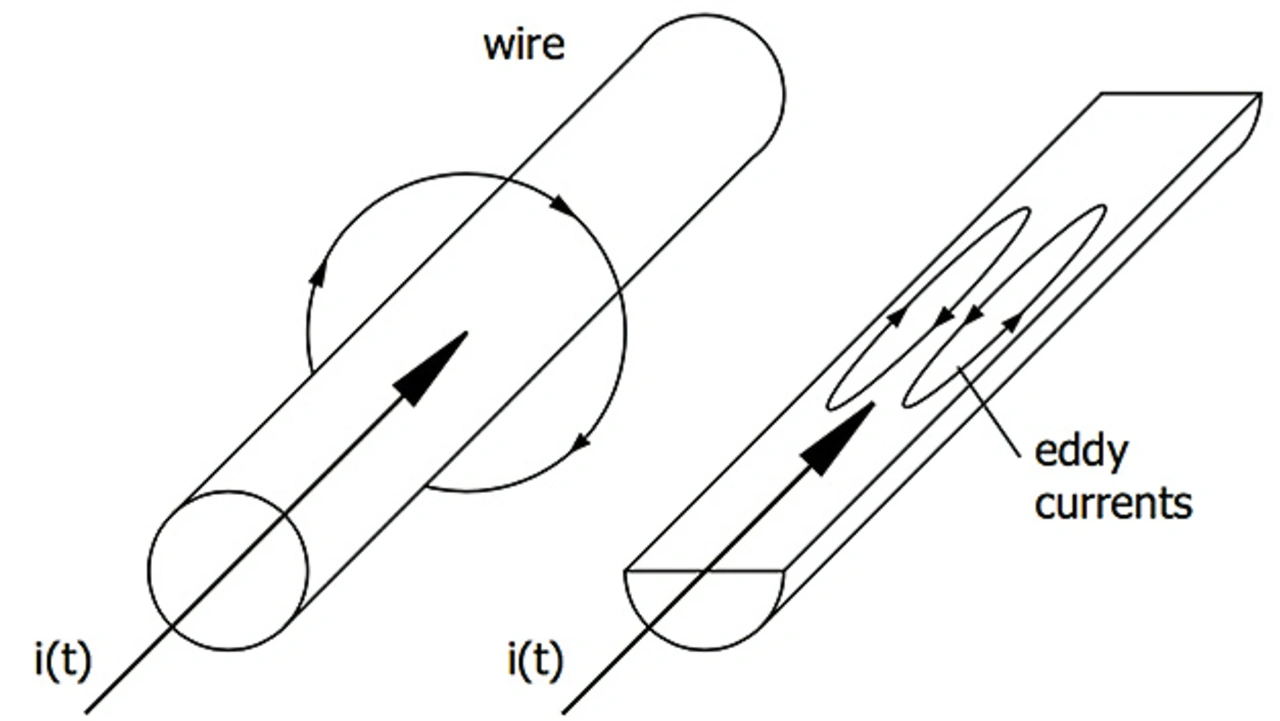 Der Skin-Effekt entsteht dadurch, dass bei hohen Frequenzen die Stromdichte über den Leiterquerschnitt nicht mehr konstant ist, weil der Strom zur Oberfläche des Leiters hin aufgrund der finiten Induktivitäten verdrängt wird. Der Leiter kann als Bündel unendlich vieler einzelner dünner Leiter betrachtet werden, deren Induktivitäten miteinander wechselwirken und dem Strom entgegenwirken (Lenz`sche Regel). An der Außenfläche des Leiters ist die Summe dieser Wechselwirkungen infolge von Wirbelströmen (Bild 2) kleiner als im Inneren des Leiters, deshalb nimmt die Stromdichte zum Leiterinneren exponentiell ab.