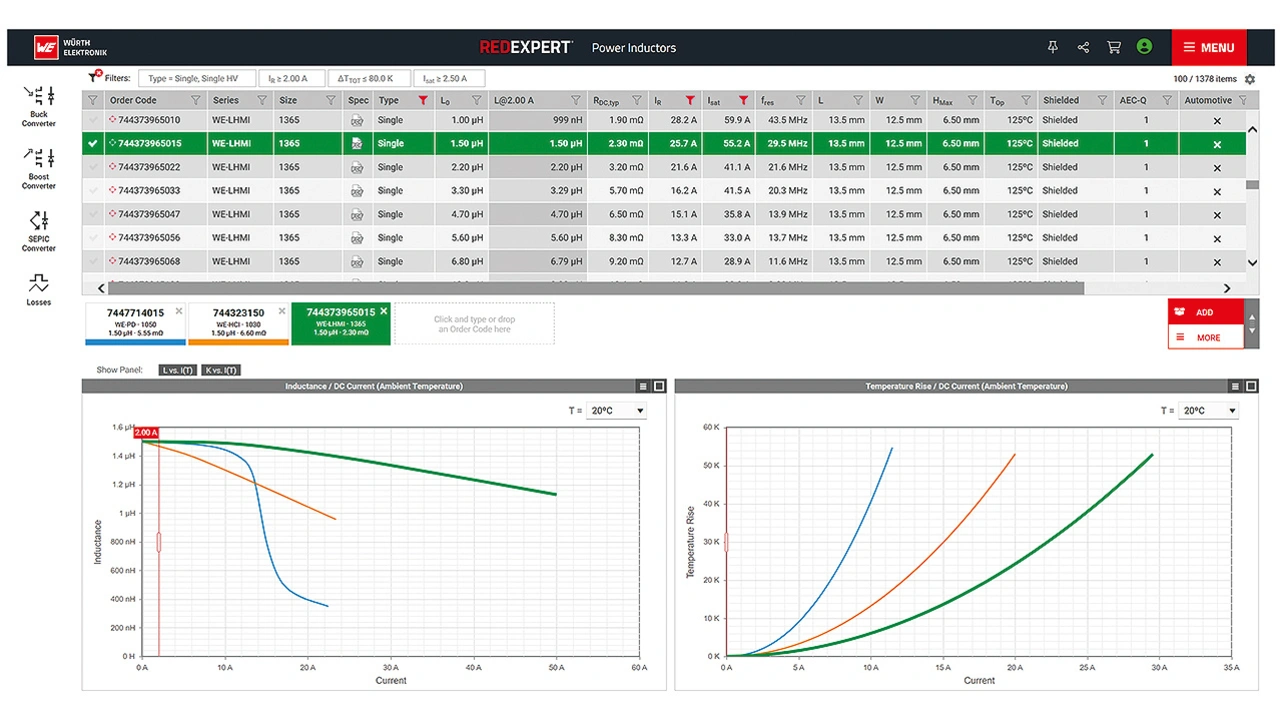 Das Online-Tool »RedExpert« zur Auswahl von Induktivitäten (Bild 4) bietet einen bequemen Zugang zu diesen Daten und die Möglichkeit, mehrere Induktivitäten sofort zu vergleichen. Wählen Sie einfach den Wandlertyp aus, geben Sie die grundlegenden Betriebsbedingungen ein und schon werden alle infrage kommenden Induktivitäten angezeigt. Sortieren und wählen Sie aus diesen eine Liste von Induktivitäten aus, die Ihren Anforderungen entsprechen, einschließlich Größe, Höhe und Form. Passen Sie die Betriebsbedingungen einfach an, um die Extremwerte Ihres Entwurfs zu prüfen. Die Diagramme zeigen sofort den gesamten Leistungsbereich einschließlich der Temperatureffekte. So können Sie als Anwender die Vorzüge der einzelnen Induktivitäten zu Ihrer eigenen Zufriedenheit vergleichen. Laden Sie dann nur die Datei mit der am besten geeigneten Induktivität herunter, und bestellen Sie gleichzeitig kostenlose Muster.