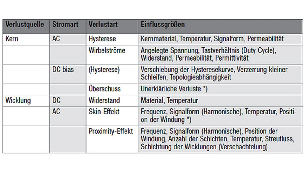 Bei elektromagnetischen Bauteilen gibt es zwei Verlustquellen: die Wicklungen und den Kern. Beide können weiter in Untertypen unterteilt werden (Tabelle 1).