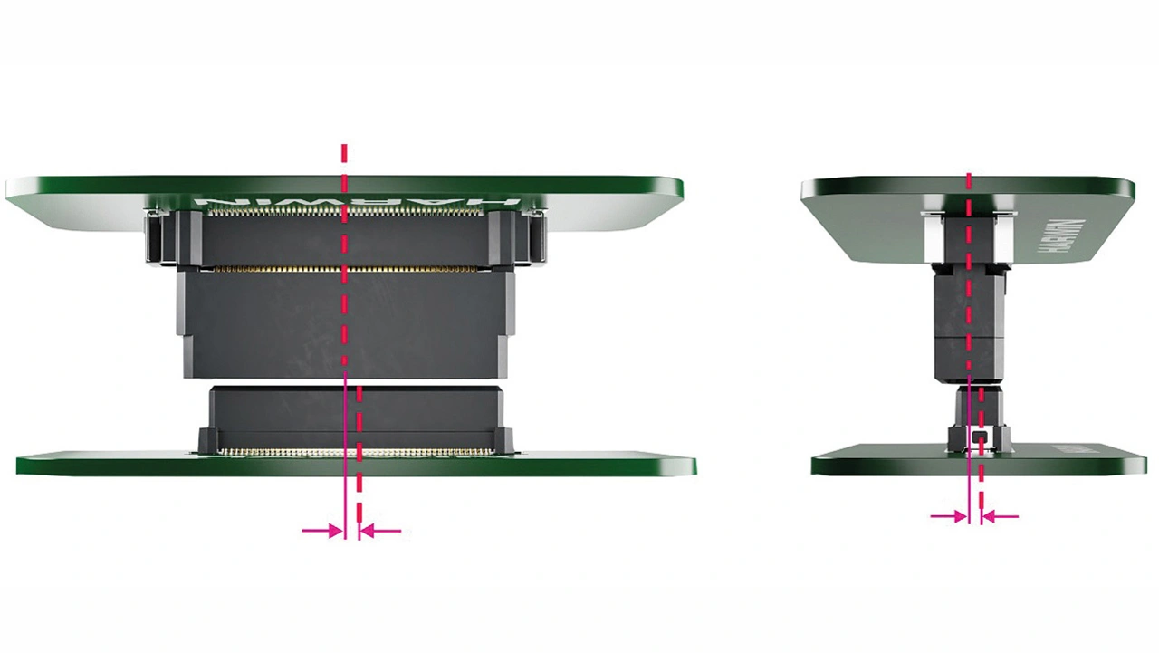 Dies stellt ein Problem dar, da selbst eine Fehlausrichtung im Mikrometerbereich – sei es aufgrund der Leiterplattenherstellung, der Position der Lötpaste, der Bestückungsgenauigkeit oder einer Kombination dieser Faktoren – die Board-to-Board-Steckverbinder übermäßig belastet, zum Beispiel durch hohe seitliche Belastung. Dies wiederum kann Schäden verursachen, die zu Qualitäts- und Ertragsproblemen bei der Herstellung und zu einer verminderten Systemzuverlässigkeit während des Betriebs vor Ort führen können.