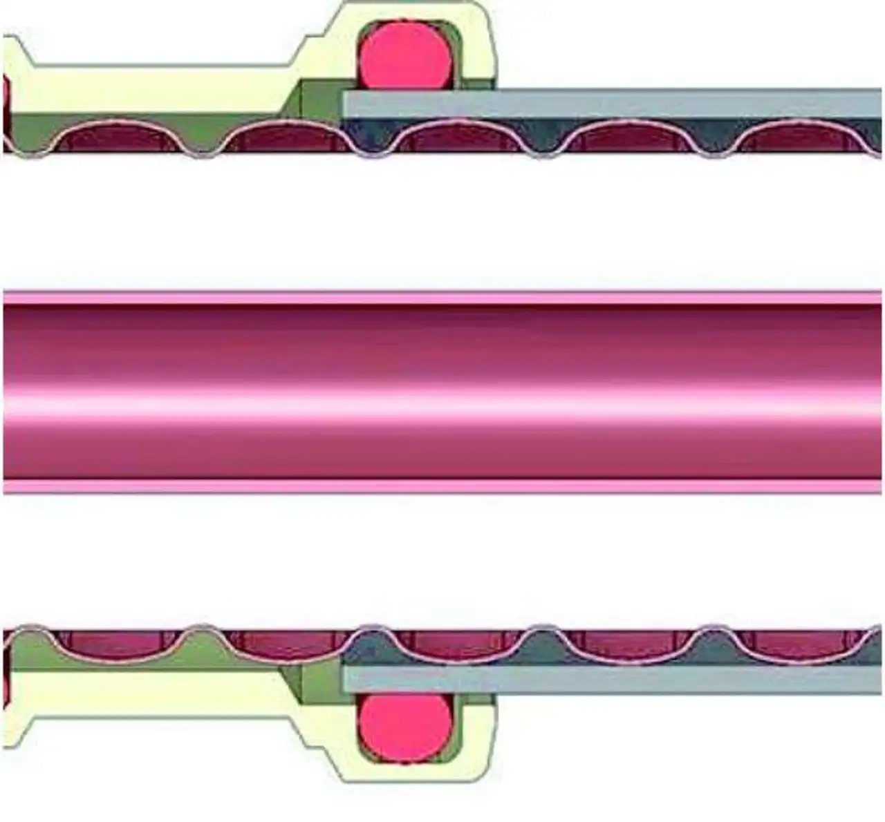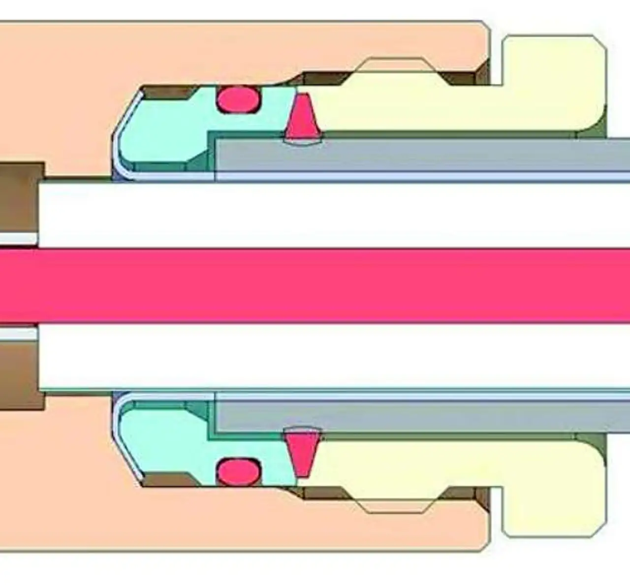 Eigendruckdichtungen halten meistens weniger dicht als zwangsgedrückte Dichtungen (Bild 2). Bei dieser wird ein Dichtelement, hier links ein O-Ring, so weit komprimiert, bis die Druckschraube (gelb) auf den Konusring (blau) stößt. An dieser Stelle ist also ein mechanischer Anschlag, der das weitere Einschrauben der Druckschraube verhindert. Somit kann auch der Druck auf das Dichtelement nicht weiter steigen und dieses beschädigen. Zwangsgedrückte Dichtungen haben nur eine geringe bis keine Voranpressung, da sie erst dichten, sobald ein Gegenstück, hier die Druckschraube, auf sie wirkt.