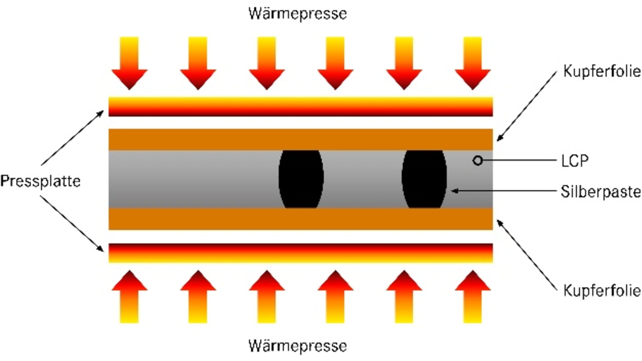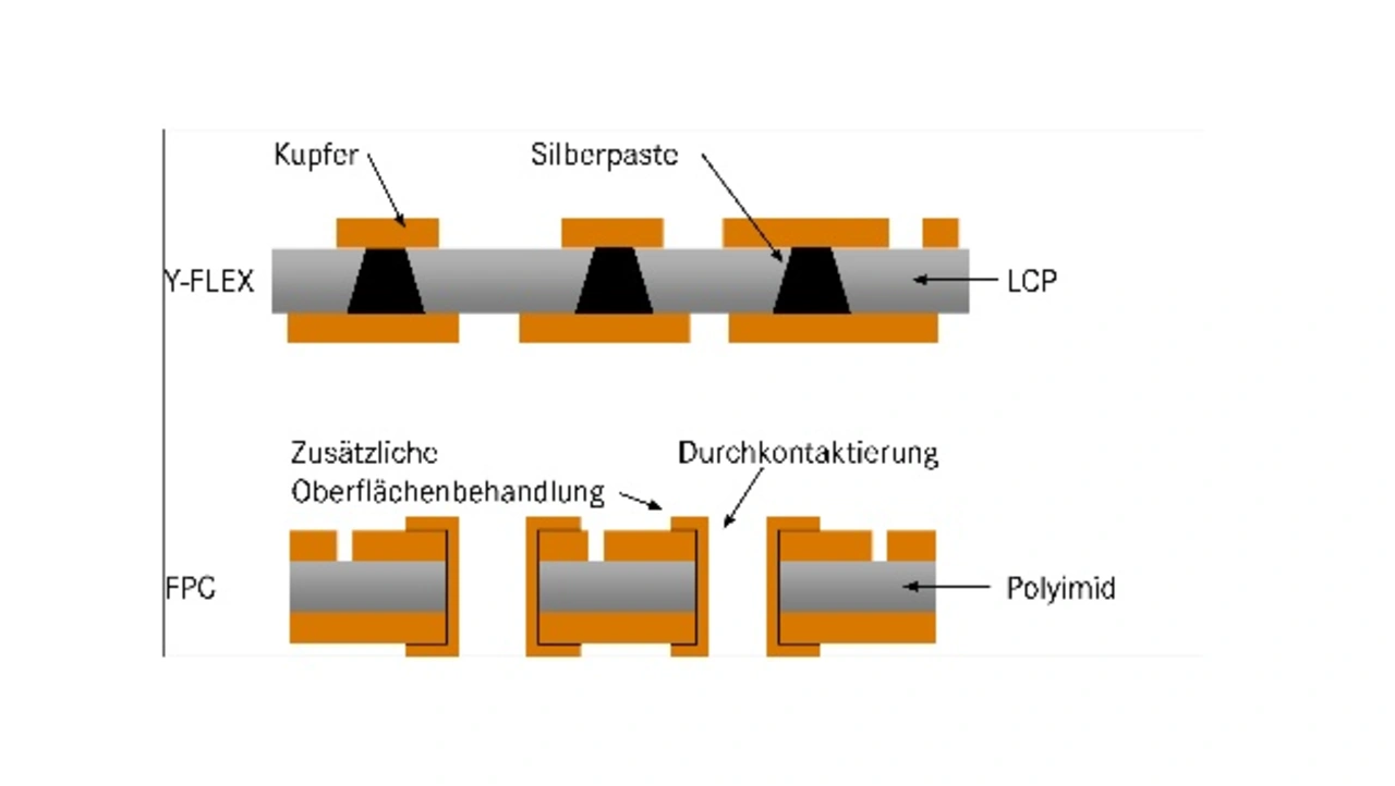 Bei Standard-FPCs wird die elektrische Verbindung zwischen den einzelnen Kupferlagen mittels THT-Durchkontaktierung (Through Hole Technology) hergestellt. Wie im Fertigungsprozess bereits beschrieben, geschieht dies bei der Y-Flex durch eine spezielle Verpressung der leitenden Silberpaste durch das LCP-Material hindurch, wodurch eine leitende Verbindung zwischen den einzelnen Kupferbahnen hergestellt wird.