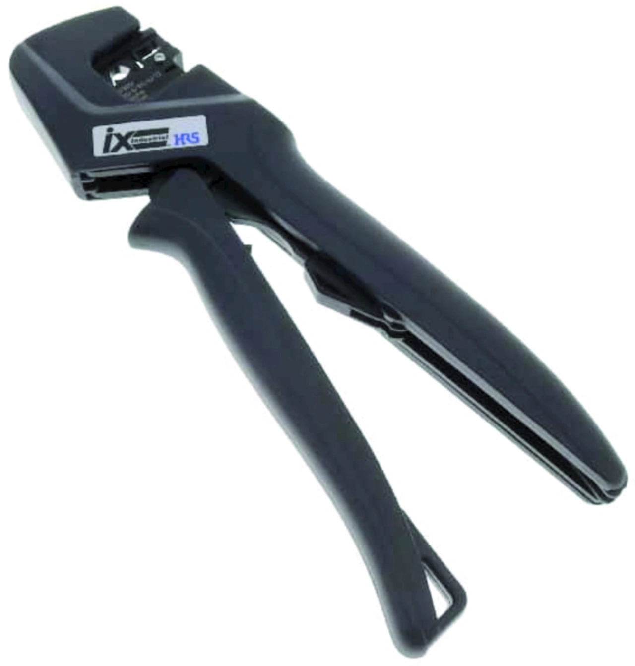 Für die Montage vor Ort bietet Hirose ein entsprechendes Kabelkonfektionswerkzeug an, das mit den IDC-ix-Steckverbindern IX30G, IX31G und IX32G verwendet werden kann. Es handelt sich um ein kombiniertes Werkzeug zum Crimpen von Kabel und Stecker sowie zum Aufpressen des Schutzgehäuses auf die Baugruppe. Bei den gelöteten IX40G-Steckverbindern wird es nur zum Aufpressen verwendet.