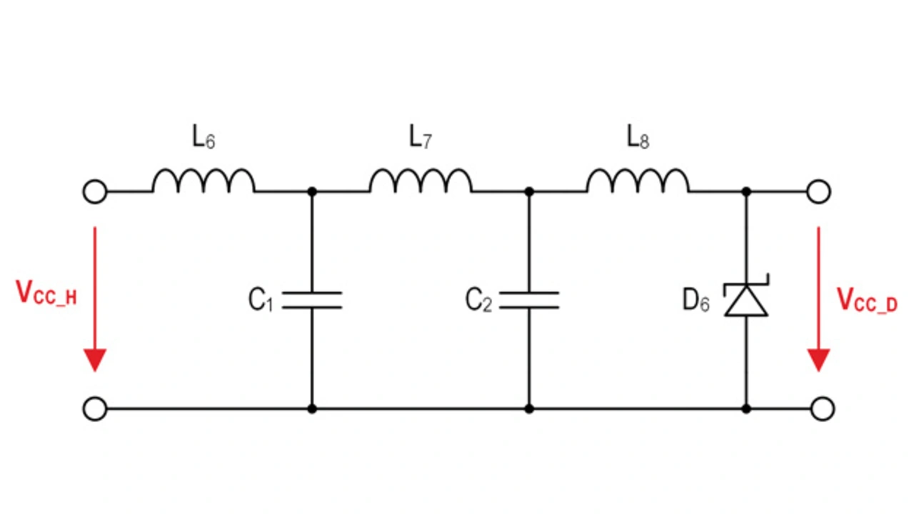 Im Folgenden wird eine 60-W-Filtervariante auf Basis eines Dongles (Bild 1) betrachtet; dieser Dongle sollte für die meisten Anwendungen und Kabelverbindungen geeignet sein. Als Filtertopologie wurde ein π-Filter gewählt, da es eine hohe Einfügungsdämpfung aufweist, da sowohl die Quelle als auch die Senke in der Stromversorgung eine niedrige Impedanz aufweisen. Dies führt zu einer optimalen Fehlanpassung und daher zu einer maximalen Unterdrückung. Um hochfrequente Einkopplung von Rauschen auf die Stromleitung zu dämpfen, kann ein Tiefpassfilter mit einer Grenzfrequenz von ungefähr 1/10 der Datenrate (5 bzw. 10 Gbit/s) verwendet werden.