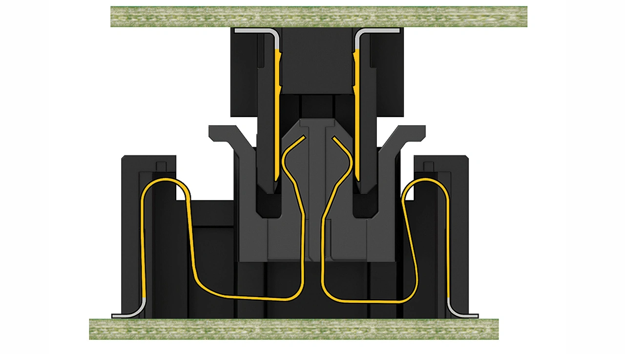 Bild 1 zeigt eine Schnittdarstellung des Floating-Steckverbinders. Auf der unteren Leiterplatte ist die Floating-Federleiste mit dem geschwungenen Kontakt und beweglichem Steckgesicht dargestellt. Von oben wird die starre Messerleiste gesteckt, die auf der oberen Leiterplatte verlötet ist. Die Messerleiste ist nach rechts verschoben, was eine Auslenkung der Floating-Kontakte bewirkt. Der Lötbereich von Messerleiste und Federleiste wird wenig belastet, da die spezielle Kontaktgeometrie Relativbewegung im Stecksystem erlaubt. Dadurch lässt sich das Steckgesicht in einem sehr großen Toleranzbereich hin- und herbewegen, wobei gleichzeitig der Lötbereich feststeht.