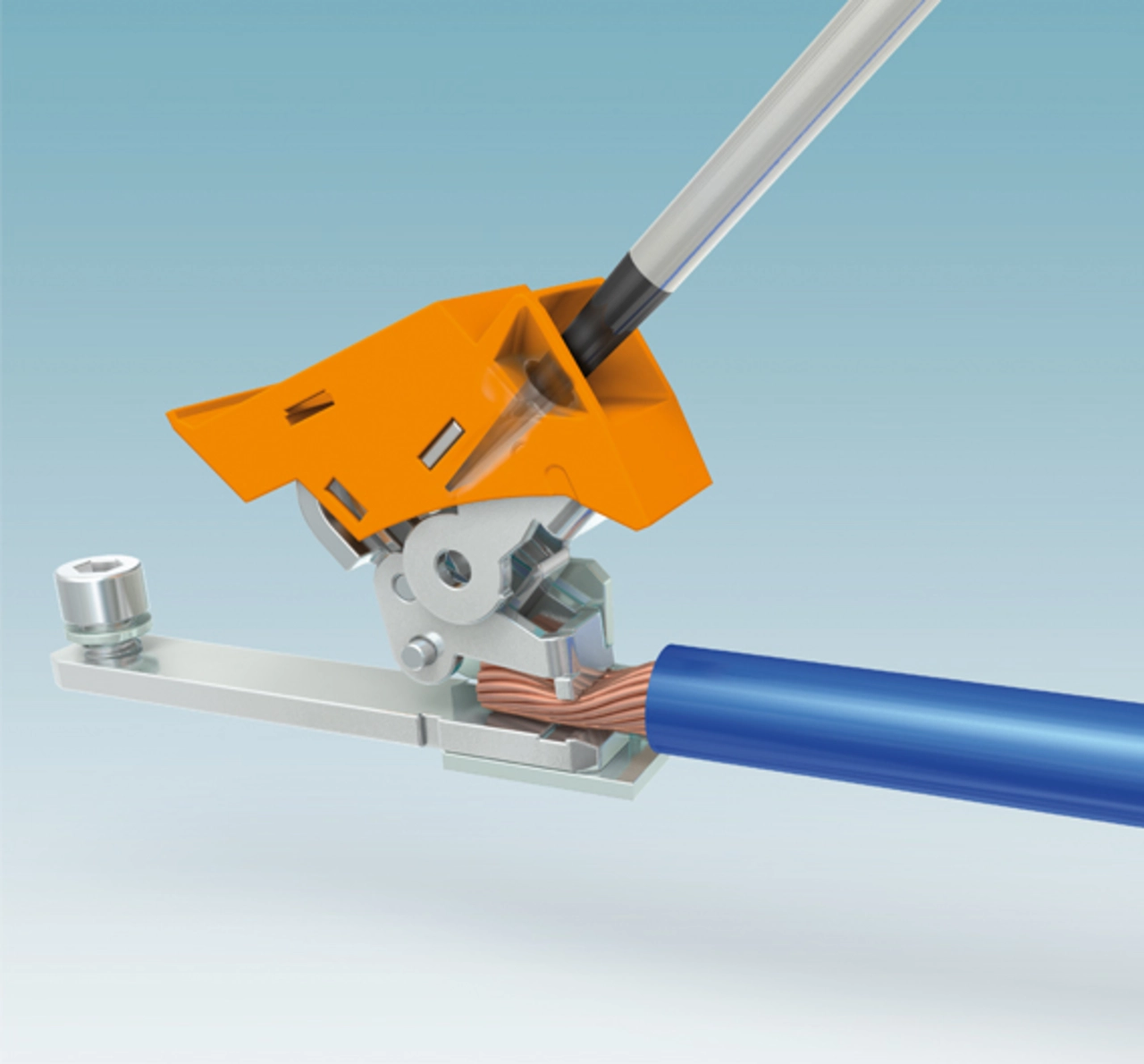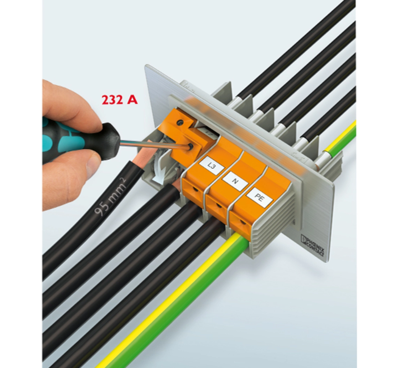 Hier nun setzt das Kniehebelprinzip an: Die Leiter werden in die geöffnete Klemmstelle eingelegt und der farblich abgesetzte Hebel wird ohne Kraftaufwand mit einem Schraubendreher umgelegt. Die Vorteile gegenüber den bisher üblichen Schraubanschlüssen: Der Hebelmechanismus erlaubt den freien Blick auf die Klemmstelle, er lässt sich mit einem handelsüblichen Schraubendreher bedienen und er kontaktiert langzeitstabil unabhängig vom Leiterquerschnitt auch bei starken mechanischen Einwirkungen. Dank der querschnittsabhängigen Kontaktkraft der Feder können Anwender selbst mehrdrähtige Leiter mit Querschnitten von bis zu 95 mm² sicher anschließen - und dies bis zu 70 Prozent schneller als mit dem herkömmlichen Schraubanschluss (Bild 1).