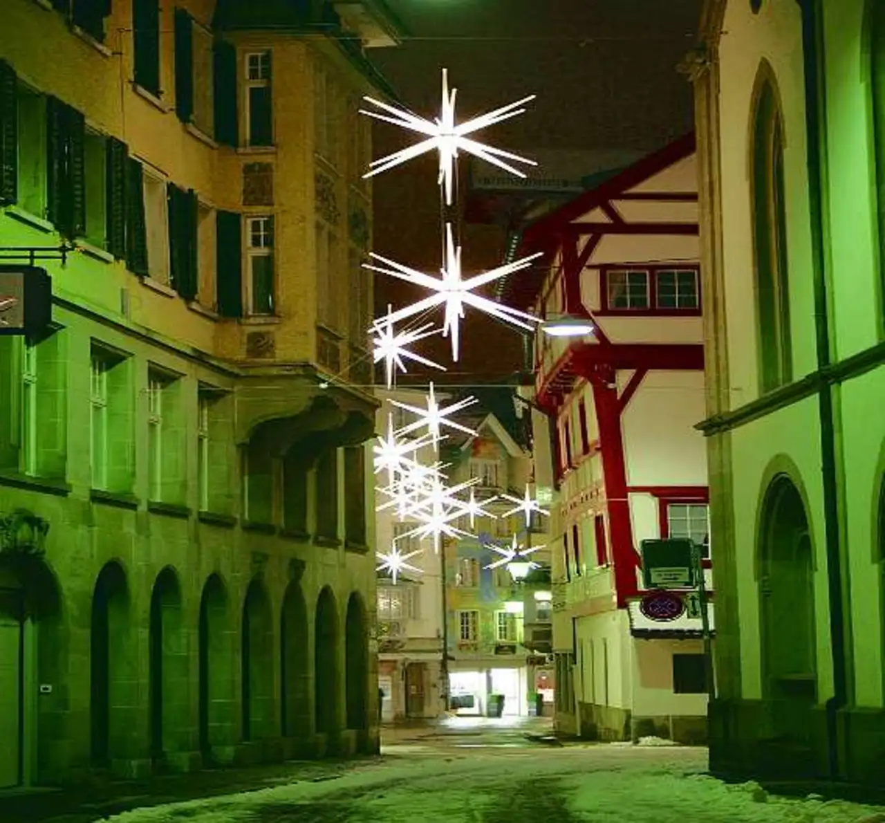 Da für die Befestigung der Sterne Tragseile in den Altstadtgassen erforderlich sind, wollte man nicht noch zusätzlich zwei verschiedene Leitungen für die Signalübertragung und Stromversorgung anbringen, deshalb kam das M12-Hybridstecksystem »CHT 4+2« von Molex zum Einsatz. Neben ästhetischen Vorteilen (weniger Kabel über den Gassen) bringt die Ausstattung mit einem Hybrid-Stecksystem auch Kosten- und Zeitvorteile, da nur halb so viele Kabel zu montieren sind wie bei konventioneller Verkabelung.