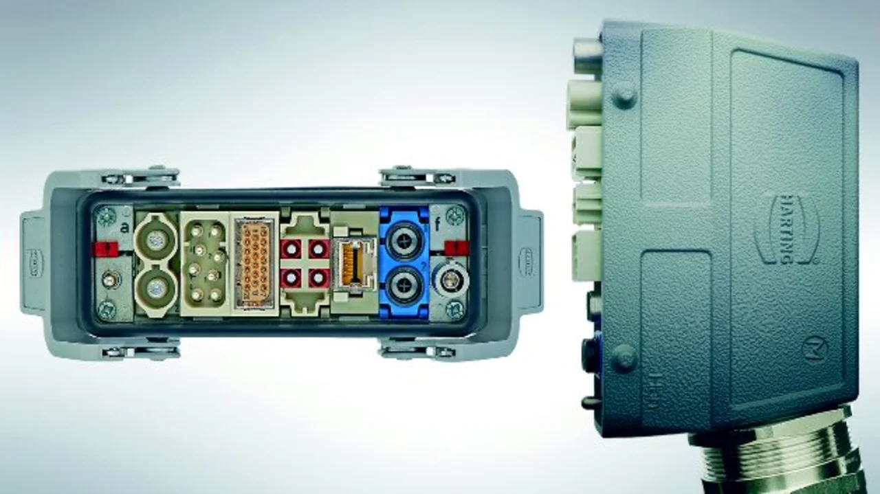 Zur Veranschaulichung: So kann ein hybrider Han-Modular-Steckverbinder für die Leistungs-, Signal/Daten- und Druckluftübertragung aussehen.