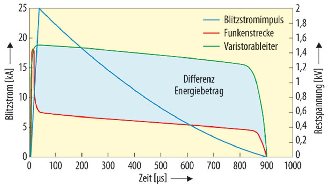 Dort, wo die Strom-Spannungs-Charakteristik des Varistors einen Vorteil für das Ansprechverhalten und die EMV-Eigenschaften des Flashtrab SEC T1+T2 darstellt, ist sie für Kombi-Ableiter, die rein auf Varistoren basieren, ein großer Nachteil. Die vergleichsweise hohe Restspannung eines Varistors während des Ableitvorgangs bedeutet einen hohen Energie-Eintrag innerhalb des SPD und damit einen hohen Grad an Alterung und Derating des Varistors. Da das notwendige Blitzstrom-Ableitvermögen für Typ-1-SPDs meist nur durch Parallelschaltung mehrerer Varistoren erfolgen kann, führt das Derating zwangsläufig zum Auseinanderdriften der mA-Punkte der parallelen Varistoren. Im ungünstigen Fall ist die gleichmäßige Aufteilung eines Blitzstroms dann nicht mehr möglich, sodass einer der Varistoren überlastet wird. Beim Flashtrab SEC T1+T2 werden die energiereichen Blitzströme durch die Funkenstrecke mit niedriger Restspannung abgeleitet. Der Energieeintrag ist minimal, ein Derating tritt weder für die Funkenstrecke noch für den Varistor auf (Bild 2).