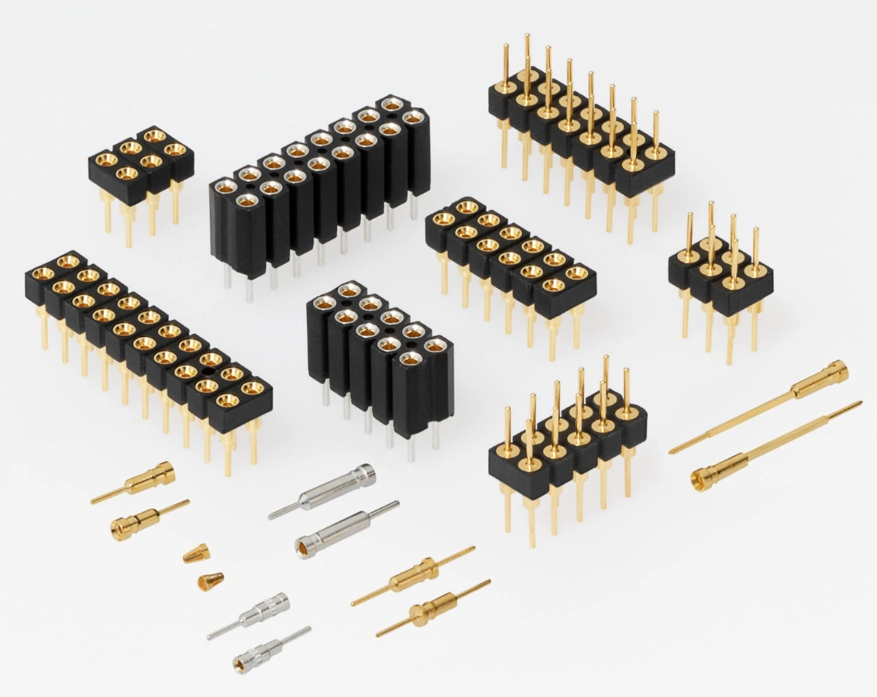 Als Gegenstecker für die genannten Kontaktfederformen werden Stift- und auch Messerkontakte verwendet. Je nach Federkontakttyp können diese Gegenstecker eine quadratische, rechteckige oder zylindrische Form haben und teilweise in mehreren oder sogar allen Formen gemischt eingesetzt werden.