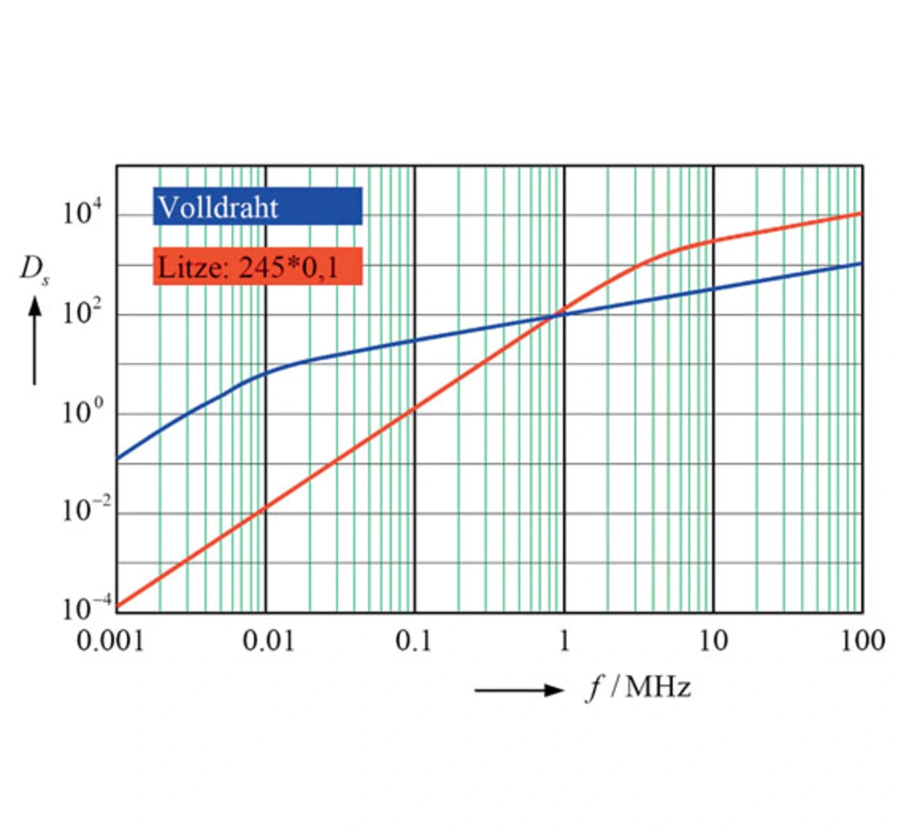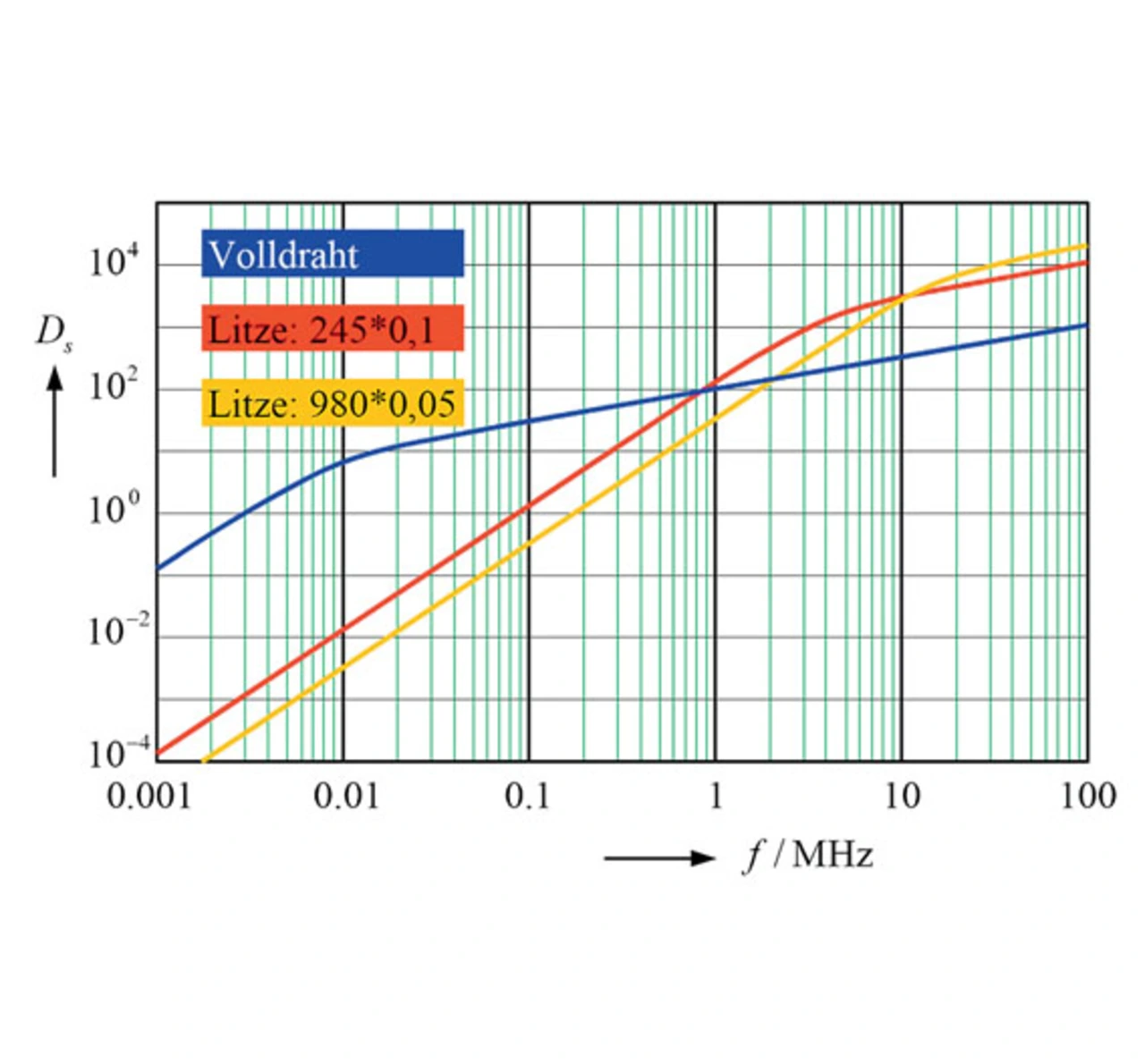 Hier entsteht die gleiche Situation wie bereits in Bild 3. Der Schnittpunkt gegenüber dem Volldraht verschiebt sich zu höheren Frequenzen, allerdings wird die feiner unterteilte Litze bei sehr hohen Frequenzen schlechter als die Litze mit weniger Adern. Ein Vergleich der Schnittpunkte in den Bildern 3 und 7 bestätigt die bereits im Zusammenhang mit Bild 5 gemachten Aussagen.
