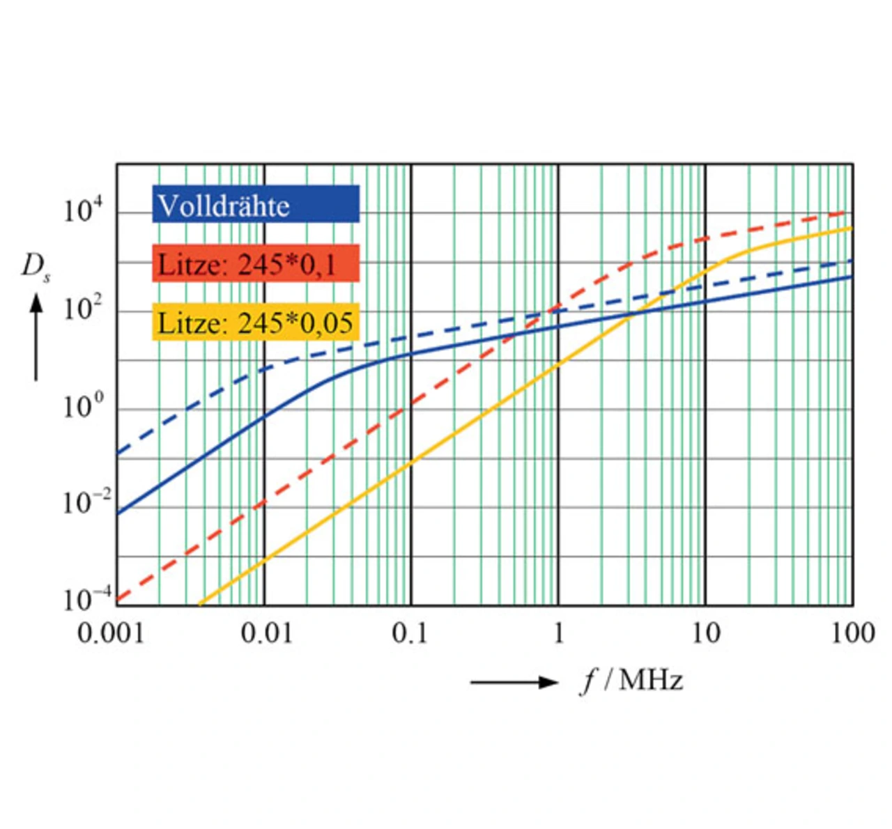 Als erster Einflussparameter wird der Durchmesser der Adern betrachtet. In Bild 6 sind nochmals die Ergebnisse aus Bild 5 gestrichelt eingezeichnet. Die durchgezogenen Linien beziehen sich auf eine Litze mit gleicher Adernzahl, aber halbem Aderndurchmesser. Beim zugehörigen äquivalenten Volldraht ist ebenfalls der Durchmesser gegenüber Bild 5 halbiert.