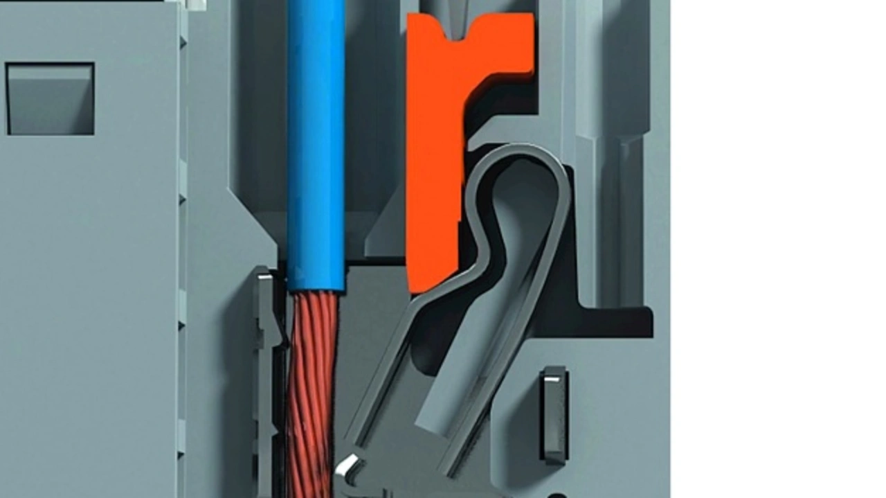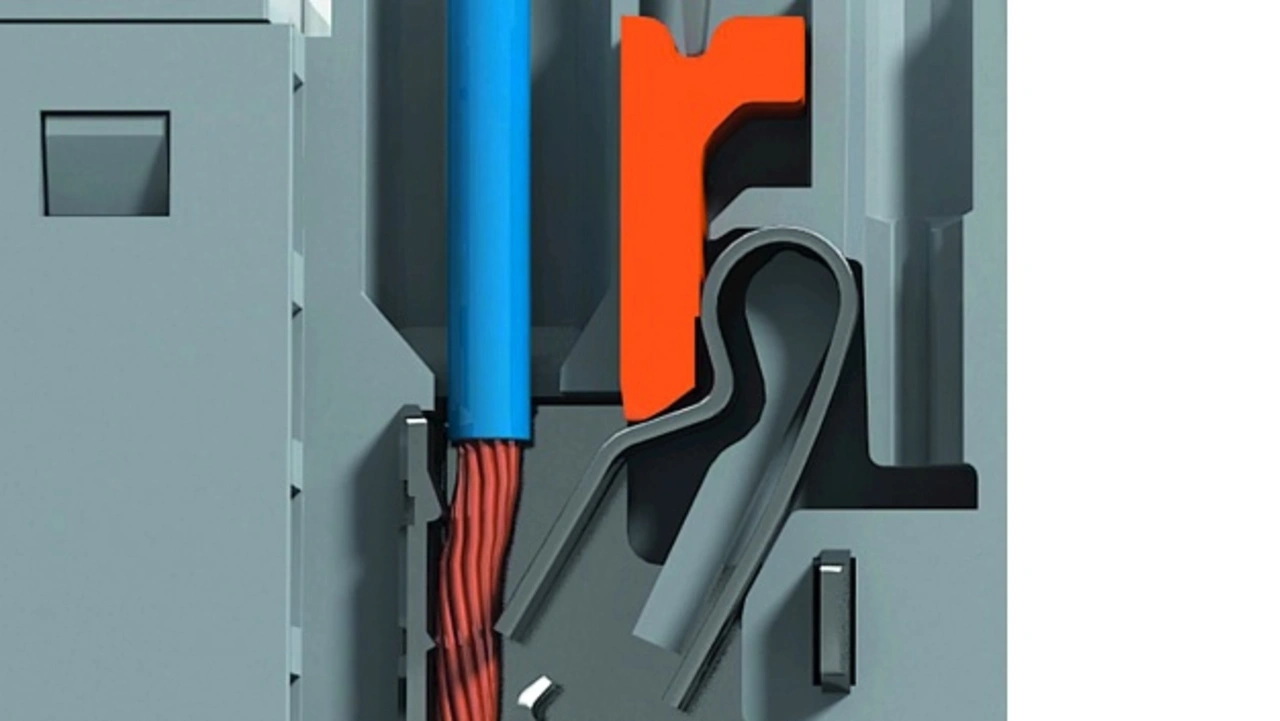 Flexible, feindrähtige Leiter, ohne aufgecrimpte Aderendhülse, lassen sich beim Snap-in-Anschlussprinzip (Fa. Weidmüller) einfach und ohne Werkzeug in die offene Anschlussstelle einstecken (Bild 1). Ein Werkzeug ist nicht notwendig. Das offene Anschlusssystem ist so gestaltet, dass es selbsttätig schließt, sobald der abisolierte Leiter die richtige Position erreicht hat und die Feder auslöst. Das Funktionsprinzip ist vergleichbar mit einer Mausefalle.