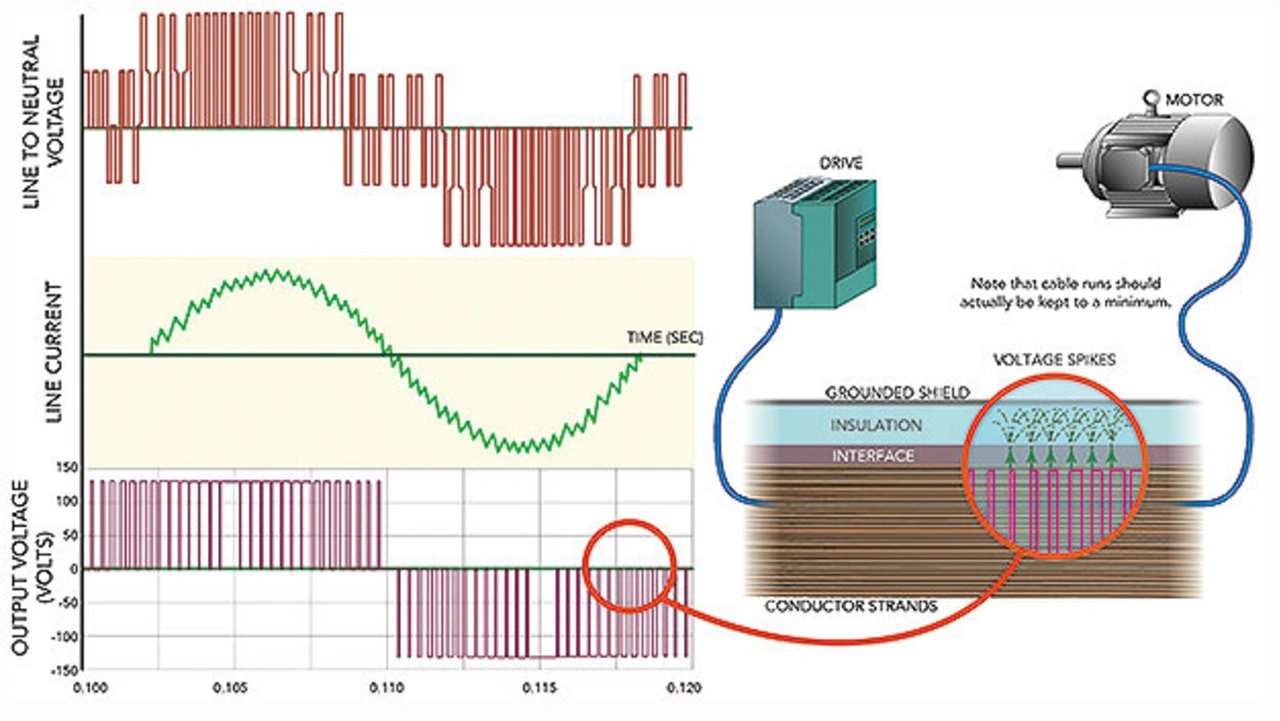 Ursache dafür ist die Funktionsweise von Frequenzumrichtern. Nachdem sie die eingangsseitige Wechselspannung aus dem Netz gleichgerichtet haben, zerhacken sie diese Zwischenkreisspannung (DC-Link Voltage) wieder in präzise modulierte Impulsfolgen (Pulsbreitenmodulation, PWM). Diese veranlassen den Motor zum Drehen, als ob er eine gleichmäßig modulierte Sinuswelle des Stroms empfängt. Die gegenüber Bipolartransistoren deutlich höhere Schaltfrequenz von IGBTs ermöglicht einerseits eine schnelle, präzise und effiziente Motorsteuerung, andererseits verursacht diese aber auch leitungsgebundene und abgestrahlte elektromagnetische Störungen.