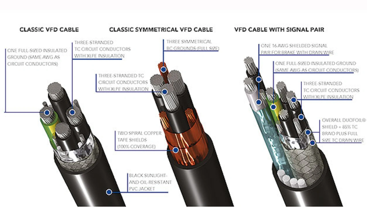 Phasengleiche überlagerte Wellen mit ausreichend hoher Spannung können nicht nur den Frequenzumrichter bedrohen, sondern auch ein unsachgemäß verwendetes Allzweckkabel beschädigen. Insbesondere Spannungsspitzen können die Isolierung des Kabels belasten, erhitzen und sogar einen elektrischen Überschlag auslösen. Um dieses Problem zu vermeiden, gibt es speziell dafür entwickelte Kabel:
