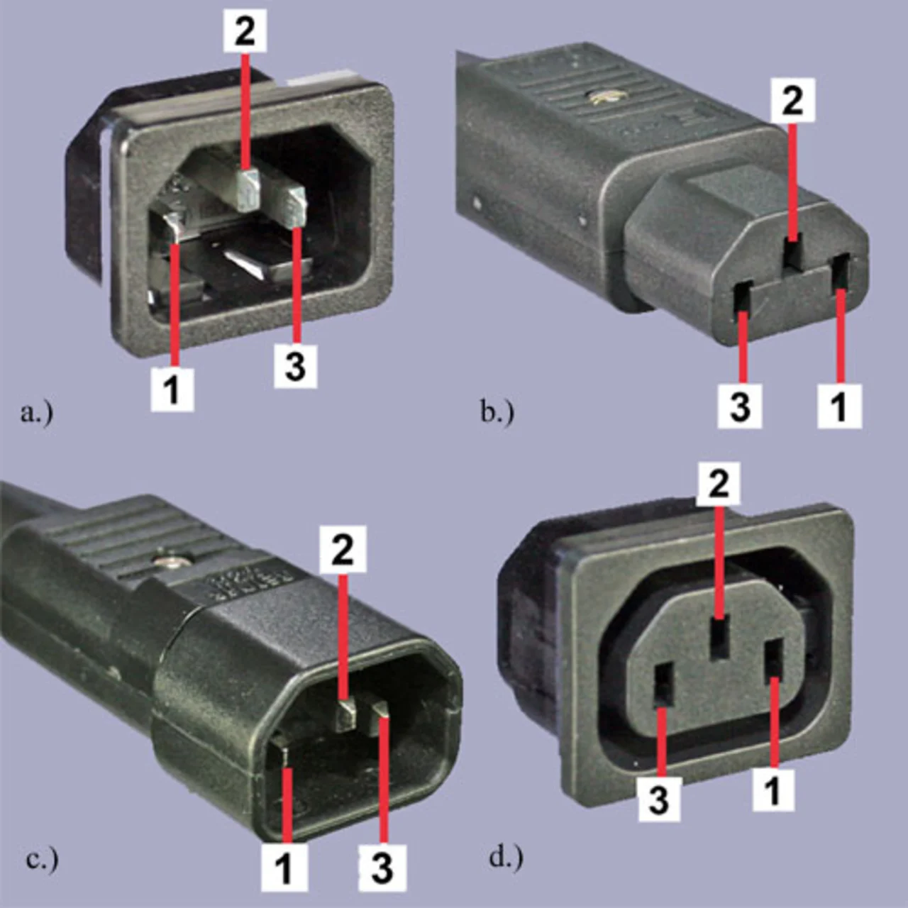 In den Bildern 2a bis 2d sind dieUnterschiede der verschiedenen Stecker- und Dosenkomponenten der Normen für Gerätesteckvorrichtung (IEC 60320-1) und Netzweiterverbindungsleitungen (IEC 60320-2-2) am Beispiel 10 A, Schutzklasse I aufgezeigt.