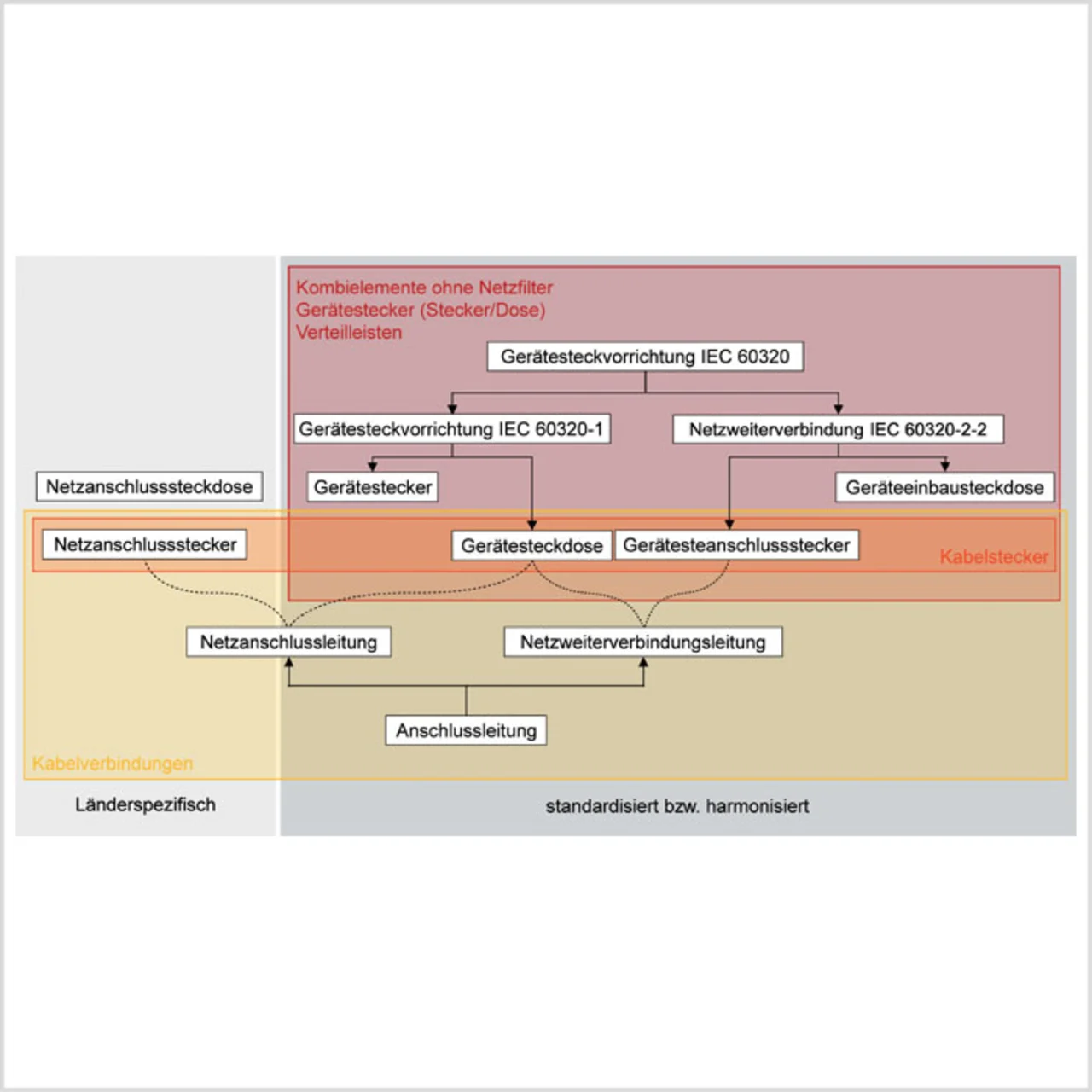 Die Sicherheit in der Stromzuführung ist aus Anwendersicht zentral. Die Norm IEC 60320 sowie deren Unternormen schaffen eine verbindliche Vereinbarung. Mechanische, elektrische und thermische Anforderungen und Sicherheitsziele steckbarer Stromzuführungen werden darin festgelegt und eine gemeinsame Basis bei der Kombination von Komponenten unterschiedlicher Herkunft geschaffen. Mögliche Sicherheitsrisiken werden beseitigt, die durch das Hinzukommen der zusätzlichen, separaten Komponente (steckbaren Netzanschlussleitung) entstehen könnten. Der Anwendungsbereich der Norm beschränkt sich auf Steckvorrichtungen für 250 V(AC) bis max. 16 A. Bild 4 zeigt eine Übersicht der normierten Verbindungselemente mit den relevanten Bezeichnungen im Umfeld der IEC 60320.