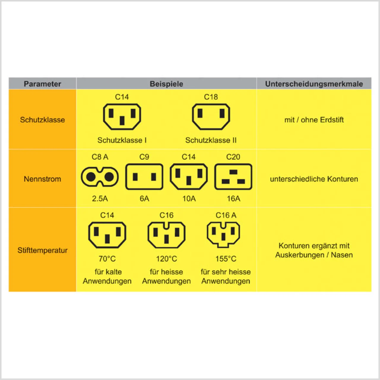 Umgekehrt passt aber eine Gerätesteckdose Schutzklasse I auf einen Gerätestecker Schutzklasse II. Das Gleiche gilt auch für den Nennstrom und die Stifttemperatur. Diese Codierung trägt maßgeblich zum sicheren Betrieb von Geräten bei und schützt vor Missbrauch. Bild 5 zeigt die unterschiedlichen Hauptkriterien mit ihren spezifischen Werten gemäß der Norm-Definition.