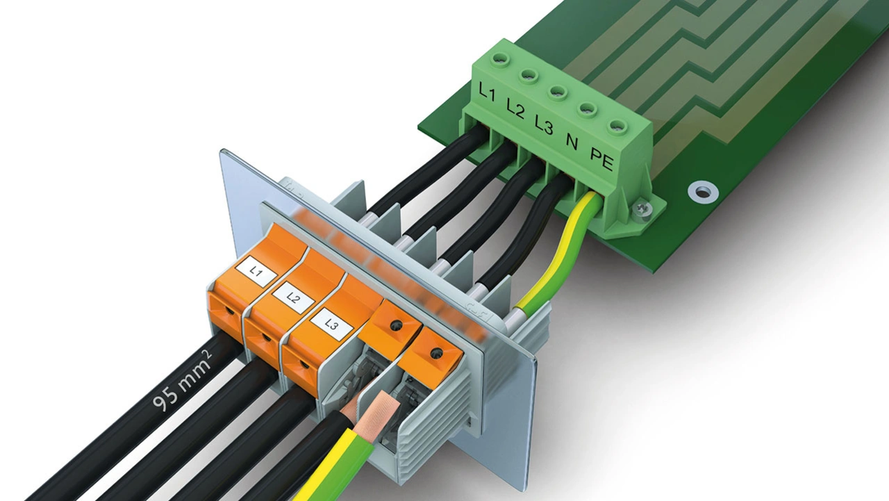 Zudem sind Leistungsanschlüsse kostenintensiv und in der Montage aufwendig. Von Stromschienen über komplexe Verdrahtungen bis hin zur zeitintensiven Montage von Ringkabelschuhen – diese Lösungsansätze der Vergangenheit bieten Potenzial für Verbesserung. Neben dem Aufwand der Montage und den Kosten ist auch der Platzbedarf dieser Lösungsansätze ein Nachteil. Durch zum Beispiel unisolierte Stromschienen oder Schraubkontakte erhöht sich der Abstand zum nächsten Potenzial. Eine Leiterplattenklemme mit Isolierkörper reduziert diesen Abstand und damit auch den Platzbedarf deutlich. Mit jeder Gerätegeneration steigen hier die Anforderungen an Kompaktheit und Wirtschaftlichkeit aller Bauteile. Schlanke, ressourcenschonende Geräte bedeuten kompakte Leiterplatten und kompakte Komponenten. Ein individueller, passgenauer Leistungsanschluss ist hierfür unerlässlich.