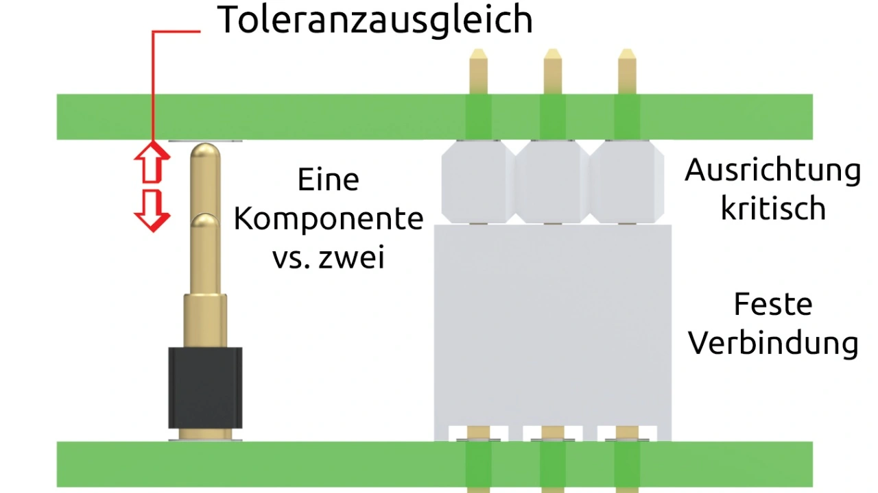 Ein weiterer signifikanter Nutzen der Federkontaktstifte ist ihre Fähigkeit, Stapeltoleranzen in Platine-zu-Platine-Verbindungsdesigns aufzufangen. Dadurch ergeben sich hochqualitative Verbindungen, weil jeder Federkontaktstift einen definierten Kolbenhub hat, der es ihm erlaubt, Toleranzen in einem beliebigen Design auszugleichen. Federkontaktstifte sind auch in Bezug auf die Positionstoleranz kulanter, da eine perfekte Ausrichtung kein so kritischer Faktor ist wie bei den meisten Steckverbindersystemen.