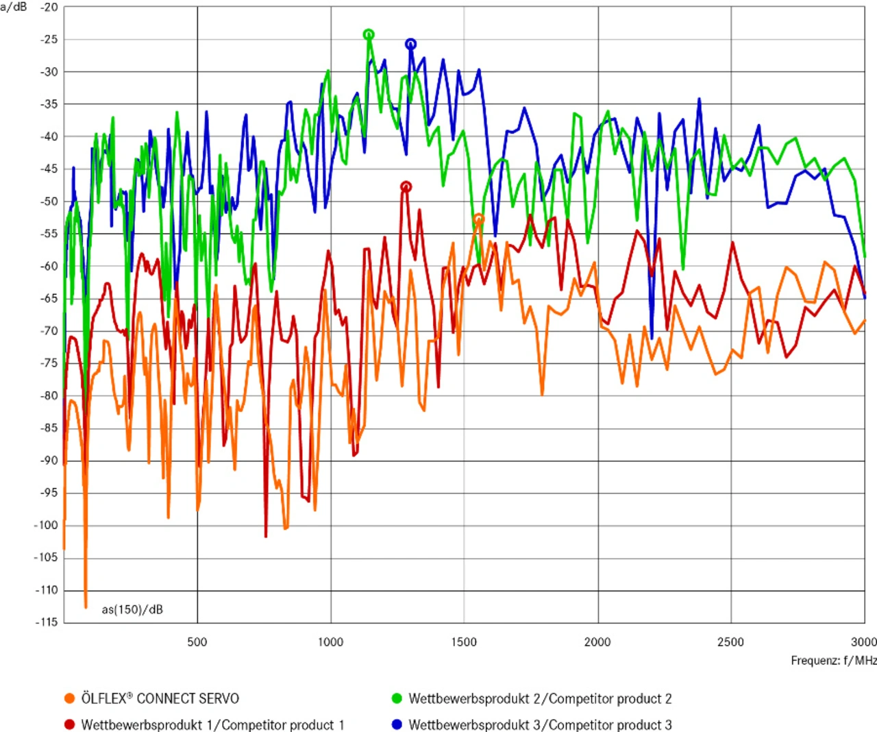 Ein besonderes Augenmerk hat man auf den Übergang von der Kabelschirmung zum Steckergehäuse gelegt: Im automatische Prozess schiebt die entsprechende Maschine die Schirmung zurück und presst sie in einem Ring in das Gehäuse. Die Drähte des Kabelschirms haben dadurch rundherum großflächigen Kontakt mit dem Stecker. Diese 360-Grad-Schirmung verbessert die Abschirmwirkung um mindestens 100 Prozent gegenüber herkömmlichen Servokonfektionen, wie die Tests von Lapp belegen.