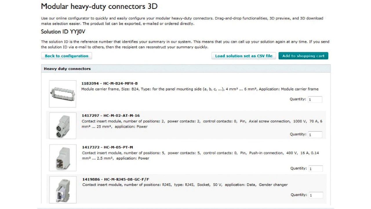 Neben der Unterstützung durch Vertriebsspezialisten vor allem für stark individualisierte Anforderungen gewinnen zunehmend Konfiguratoren an Bedeutung, die durch Kunden und Anwender direkt bedienbar sind. Anstatt sich in herstellerspezifische Systematiken und Bezeichnungen einzuarbeiten, wählt der Interessent – etwa über Filterfunktionen – die gewünschten Kontakteinsätze aus. Alle weiteren erforderlichen Komponenten werden dann Schritt für Schritt hinzugefügt. Moderne benutzerfreundliche Konfiguratoren, wie der Heavycon 3D von Phoenix Contact, erlauben es dem Anwender, aus einer bildlich dokumentierten Auswahlliste die gewünschten Komponenten per »Drag & Drop« zusammenzufügen.