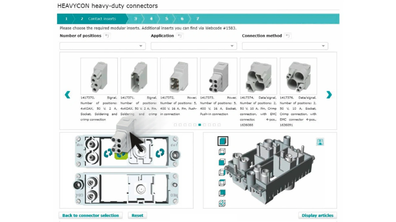Neben der Unterstützung durch Vertriebsspezialisten vor allem für stark individualisierte Anforderungen gewinnen zunehmend Konfiguratoren an Bedeutung, die durch Kunden und Anwender direkt bedienbar sind. Anstatt sich in herstellerspezifische Systematiken und Bezeichnungen einzuarbeiten, wählt der Interessent – etwa über Filterfunktionen – die gewünschten Kontakteinsätze aus. Alle weiteren erforderlichen Komponenten werden dann Schritt für Schritt hinzugefügt. Moderne benutzerfreundliche Konfiguratoren, wie der Heavycon 3D von Phoenix Contact, erlauben es dem Anwender, aus einer bildlich dokumentierten Auswahlliste die gewünschten Komponenten per »Drag & Drop« zusammenzufügen.