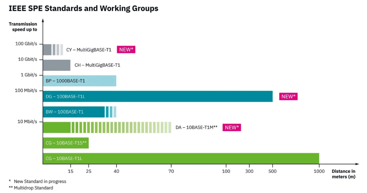 Der 10BASE-T1M-Standard ist die Erweiterung des bereits veröffentlichten Multidrop-Standards 10BASE-T1S (CG). Er soll neben einer erhöhten Reichweite und Anzahl an Kommunikationsteilnehmern (Knoten) auch eine geteilte Leitungsübertragung (MPoE, Multi Power over Ethernet) ermöglichen. Mit dem neuen Punkt-zu-Punkt-Standard 100BASE-T1L (DG) erhöht sich die Reichweite der 100-Mbit/s-SPE-Datenübertragung auf 500 m (vorher 40 m), wodurch die 100 m des klassischen Fast Ethernet künftig auch mit SPE abgedeckt werden können.