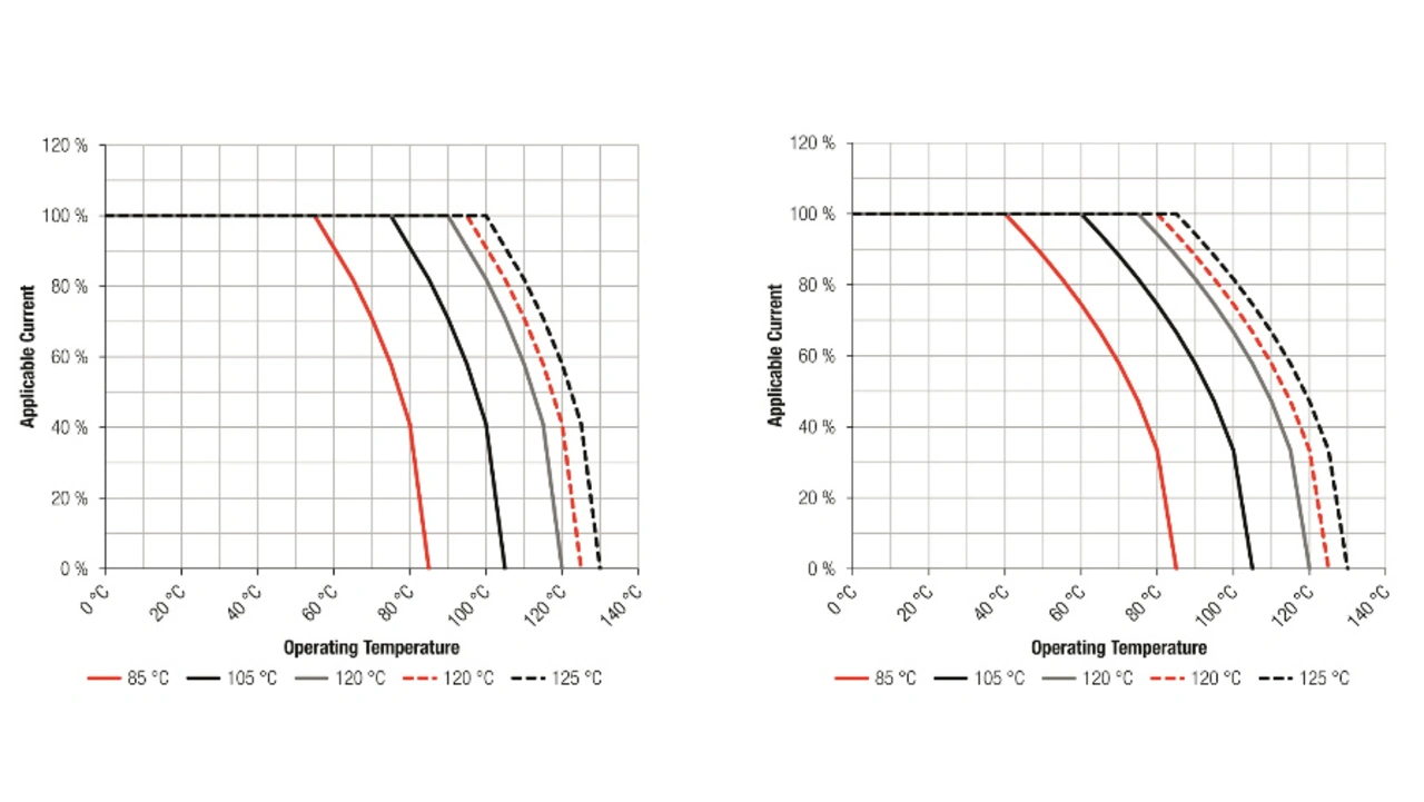 Nun stellt sich die Frage: Kann das Produkt mit dem maximalen Betriebsstrom bei der maximal zulässigen Temperatur betrieben werden? Die Antwort lautet: Wir sollten den Strom anpassen, um eine zu hohe Temperatur am Produkt zu vermeiden, da dies seine Lebensdauer verkürzt. Dafür stehen Derating-Kurven zur Verfügung. Sie sind wie folgt aufgebaut: