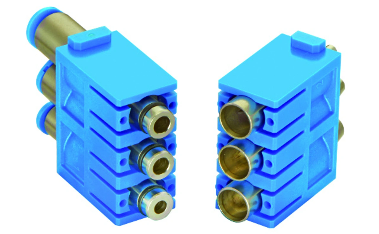 Indem Harting eine Anschlusstechnik nach dem Push-Pull-Prinzip integriert hat, reagiert das Unternehmen auf Veränderungen bei den Industriestandards für Anschlusstechniken von pneumatischen Komponenten. Das Han-Pneumatik-Modul Metall hebt sich wie sein Vorgänger für Kunststoffkontakte durch die blaue Farbe von den elektrischen Modulen ab. Auf Kontaktstifte und -buchsen passen Schläuche mit den Durchmessern 3 mm, 4 mm und 6 mm. Optional sorgen Absperrventile in den Buchsen dafür, dass der Luftdruck in einer Applikation aufrecht erhalten bleibt, selbst wenn der Steckverbinder gezogen wird. Beim Han-Modular-Pneumatik-Modul Metall sind keine Führungsstifte und -buchsen nötig. Deshalb lassen sie sich mit allen Han-Modular-kompatiblen Gehäusen kombinieren, darunter Han-Eco, Han-Yellock und die Standardgehäuse Han A und Han B.