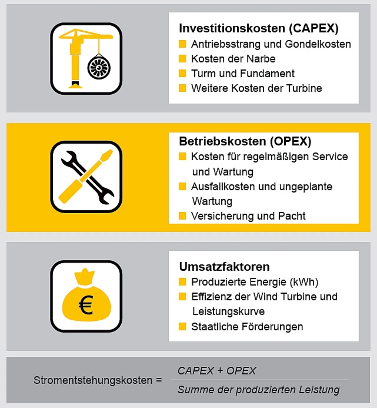 Für Errichter und Betreiber sind Wirtschaftlichkeit und Effizienz bei Standorterschließung, Aufbau, Betrieb und Wartung der WEA von herausragender Bedeutung. Sie bestimmen über die Höhe der Investitions- und Betriebskosten (CAPEX/OPEX, Bild 1) – und legen damit fest, welchen Beitrag eine WEA zur Energiewende leisten kann. Anlagen, die nicht verfügbar sind, produzieren keine Energie, erzielen keine Einspeisevergütung und lassen Umsatzpotenzial ungenutzt.