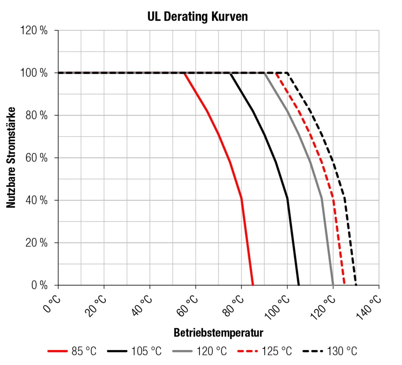 Es gilt jedoch eine zu hohe Temperatur am Produkt zu vermeiden, da dies seine Lebensdauer verkürzt. Deshalb ist es nötig, den Strom entsprechend anzupassen. Derating-Kurven helfen und bauen sich wie folgt auf: