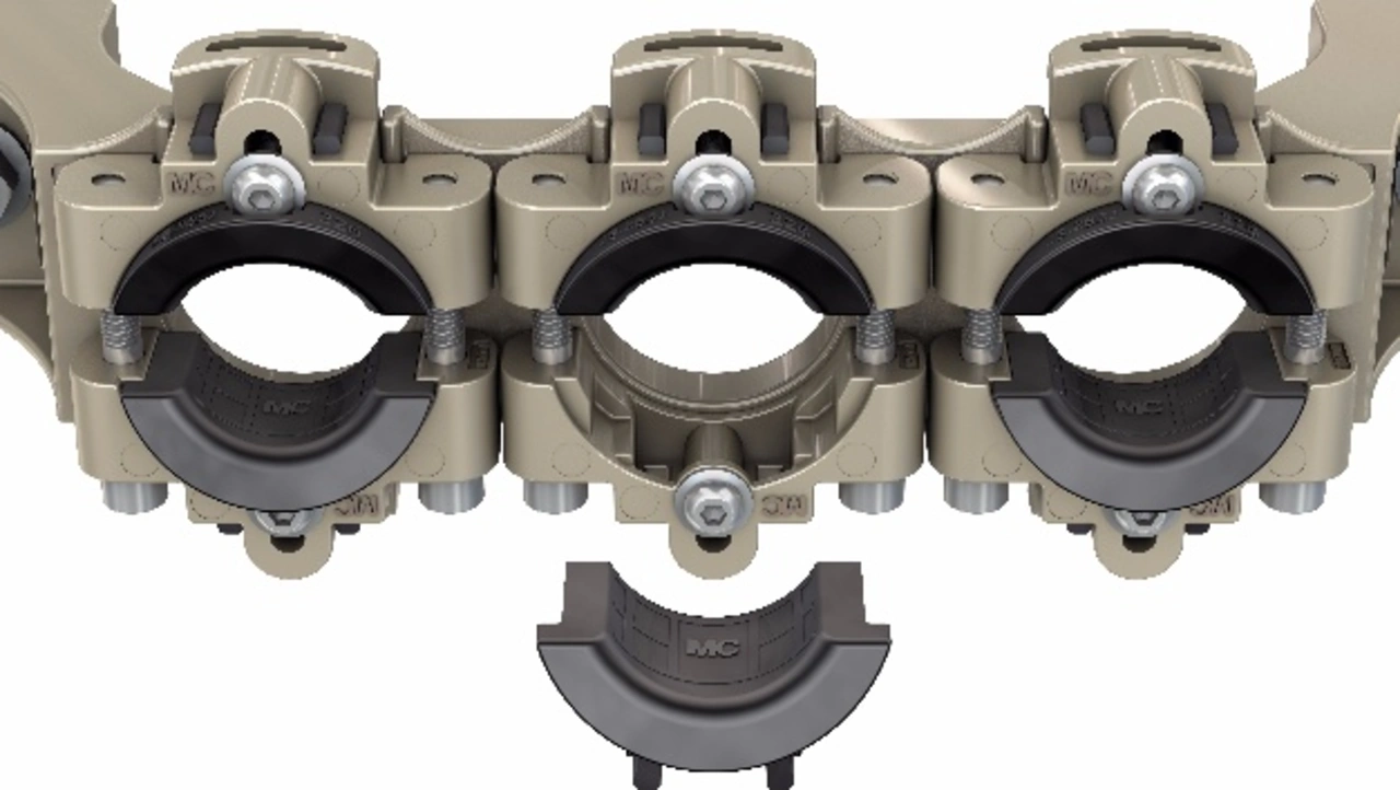Das System eliminiert mechanische Belastungen an den Kabelverschraubungen und trägt zur Langlebigkeit der Steckverbinder bei. Kunststoff-Einleger sorgen dafür, dass Kabel mit unterschiedlichen Durchmessern gleich zuverlässig fixiert sind.
