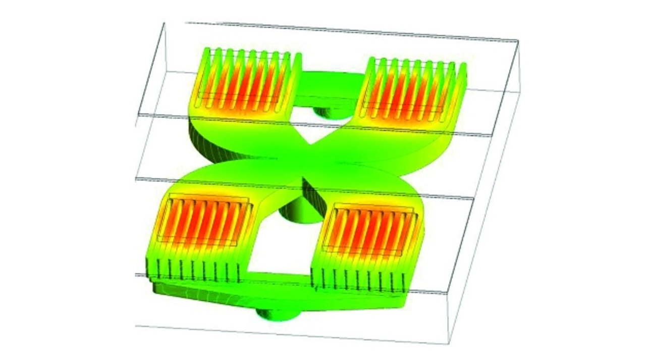 Die Kurven zeigen, wie sich in Kühler nach den Vorgaben optimieren lässt. Die gewählte Geometrie ist dabei nur ein Beispiel. Eine andere Struktur, ebenfalls für eine Halbbrücke, zeigt die Simulation in Bild 10. Da sich »grüne«, also ungesinterte, Keramik strukturieren und gemeinsam versintern lassen, bieten sich eine Vielzahl von Möglichkeiten, den jeweiligen Anforderungen gerecht zu werden.