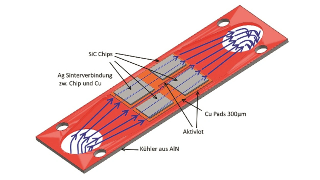 Im Folgenden wollen wir anhand eines auf der oberen Seite metallisierten Keramikkühlers für eine Halbbrücke darstellen, wie dieser sukzessiv optimiert wurde. Ausgangspunkt war ein Keramikkühler aus AlN mit aktivgelötetem, 300 µm dickem Kupfer, auf das die SiC-Chips mittels Ag-Sintern aufgebracht wurden (Bild 4). Als Kühlflüssigkeit dient ein Wasser-Glykol-Gemisch 50/50. Wir betrachten nun die Temperaturdifferenz zwischen Chip und Kühlmedium. Mit ihr sind alle thermischen Schnittstellen abgebildet, sodass das Ergebnis als praxisnah gelten kann. Der Einfachheit halber haben wir für die größeren Chips eine Fläche von 1 cm² gewählt. Somit ist der Wert von Rth gleich dem von R’th.