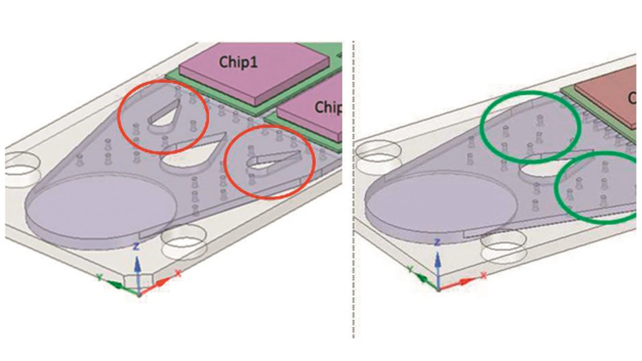 In der ersten Optimierungsrunde wurden unter den Chips gezielte Verwirbelungen erzeugt, indem eine wellenartige Struktur sowie Strukturen zur Homogenisierung der Strömung auf der Oberseite der unteren Lage eingebracht wurden. Es entstand ein sogenanntes Tropfendesign (links in Bild 5). Damit stieg die Kühlleistung bereits signifikant.