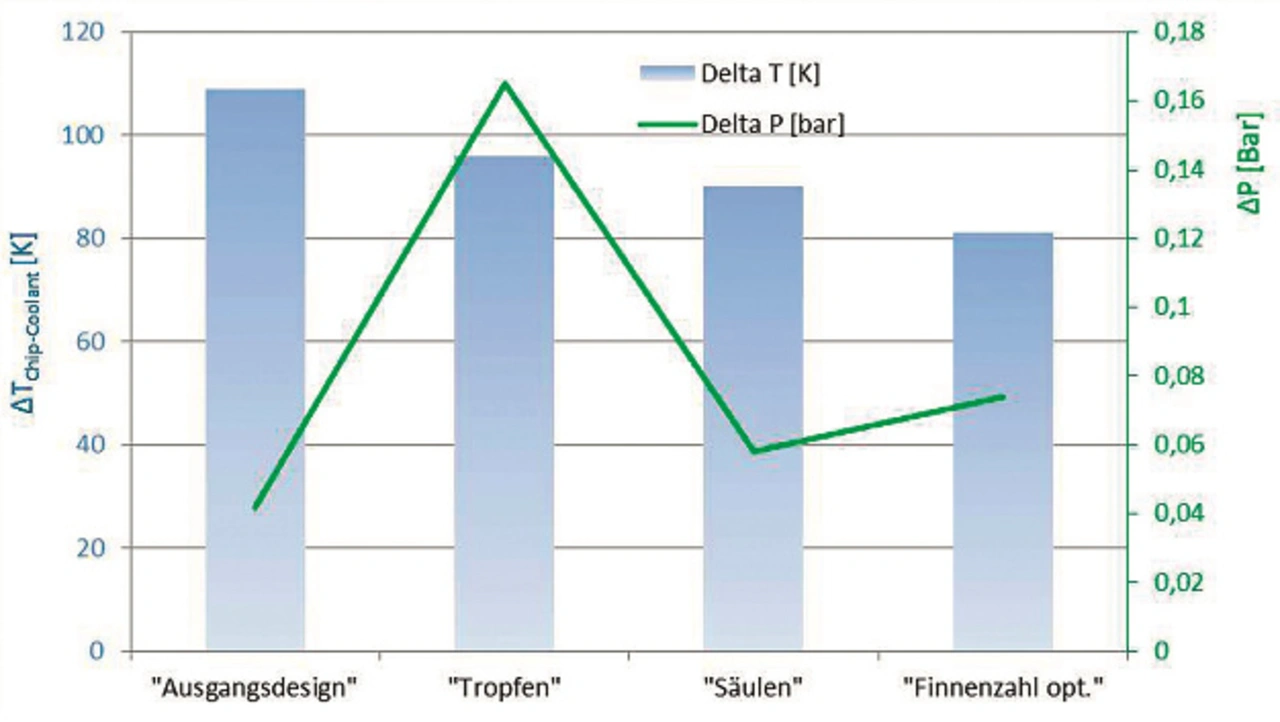 Damit hat sich gezeigt, dass mit diesen Veränderungen der thermische Widerstand im Vergleich zu einem einfachen Kühler ohne Innenstruktur deutlich gesenkt werden kann. Durch geschickte Auslegung der Strukturen steigt der Strömungswiderstand dadurch nur geringfügig (Bild 6).