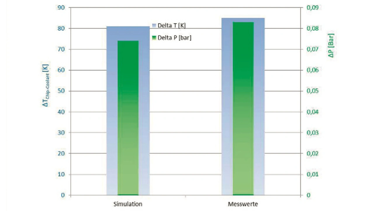 Die in der Simulation optimierte Innenstruktur des Kühlers sollte natürlich auch der Realität standhalten, weswegen der Kühler aufgebaut und vermessen wurde. Beim Vergleich von Simulation und Kühler schneidet die reale Messung um ca. 12 % schlechter ab (Bild 7). Dies ist ein sehr guter Wert angesichts der relativ schwierigen exakten Messungen von ΔT und ΔP.