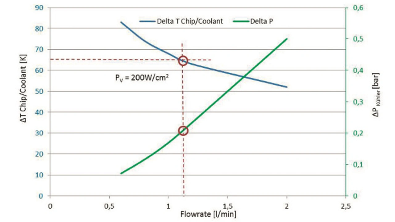 Die in diesem Prozess gefundene und verifizierte Innenstruktur bot noch Potenzial, da der Druckverlust mit 0,08 bar moderat ausfällt. Im nächsten Schritt untersuchten wir deshalb die Druck/Durchfluss-Kennlinie sowie den Temperaturunterschied ΔT per Simulation bei verschiedenen Arbeitspunkten. Ebenso ermittelten wir den Einfluss des Durchströmungsquerschnittes auf den Druckverlust und die Entwärmungsleistung. Dabei betrachteten wir nicht die durchschnittliche Chiptemperatur, sondern die maximale Chiptemperatur in dessen Mitte, was praxisnäher ist. Bei einer Kühlmitteltemperatur von +110 °C und einer maximal zulässigen Chiptemperatur von +175 °C ergibt sich ein ΔT von 65 K. Daraus ermitteln sich grafisch aus Bild 8 die Durchflussmenge mit etwa 1,1 l/min und ein Druckverlust von ungefähr 0,21 bar.